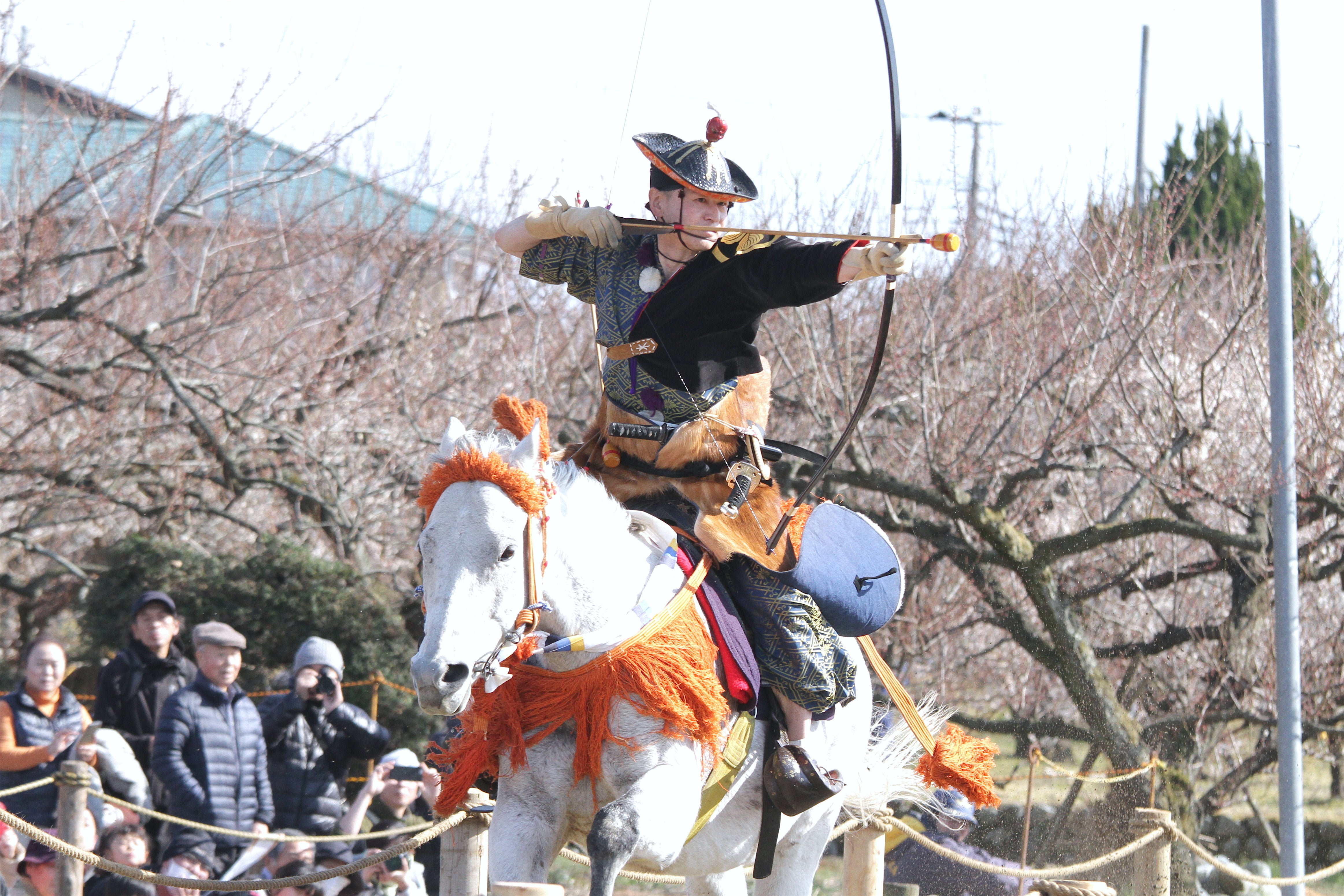 鎌倉教場の「今」をお伝えします。今回は、「明治神宮流鏑馬神事」と「稽古の成果」についてです。令和3年11月3日に明治神宮で流鏑馬を奉納しました。大日本弓馬会が奉納している流鏑馬の中でも、最も長い期間に渡って継続しているのが、この明治神宮の御例祭を奉祝して行われる流鏑馬です。先の大戦の影響で一時中断していた時期もありますが、最初の奉納から90年近くが経過した今も尚、変わらずに続けられています。当時は、馬の輸送手段がなく、鎌倉から馬に乗って明治神宮まで遠路行軍しており、いざ鎌倉ならぬ、いざ明治神宮であったとのこと。流鏑馬の伝統を今日まで繋いで来られたのも、こうした諸先輩方の苦労と功績があったこらこそであり、今更ながら感謝の念に堪えません。現在は、馬は馬運車で、人は車か電車で移動するようになり、当時の大先輩方からすれば、何とも楽な奉納に思えるのかもしれません。しかしながら、労力の点は往時よりも楽になったかもしれませんが、この明治神宮流鏑馬神事は、大日本弓馬会にとって最大の表舞台でもあることから、精神的な気楽さなどは皆無です。特に、ここ最近は、天下泰平・五穀豊穣・万民息災のみならず、新型コロナウイルス感染症の早期収束も祈願していますので、より一層、騎射にも熱が入るというものです。さて、当日は素晴らしい好天に恵まれました。真っ青な空に明治神宮の深い緑の杜、そこに設置された木火土金水の式の的、まさに絵になる光景です。もっとも、感染症対策のため残念ながら無観客での開催となり、例年楽しみにしていらっしゃる皆様には大変申し訳なく思っています。出場した射手は9名で、同じく感染症対策の観点から、行事の時間短縮を見込み、例年よりも人数が減っています。奉射に出場した射手9名の成績は、6射中6的中が2名6射中5的中が4名6射中4的中が3名と全体の的中率が8割を超え、少なくともここ数年では最高を記録しました。競射の的中成績は並程度でしたが、一の的から三の的まで満遍なく割れ、全体としては好成績であったといえます。特筆すべきは、矢番えに失敗して的を射ずに通過する射手が少なかったことです。的を射た後、次の的まで4~5秒しかありません。その短い時間の中で腰から矢を抜き、弦に番え、弓を打ち上げ、次の的に狙いをつけなければなりません。この技術は非常に難しく、先人の中には射るよりも難しいという方もいた程です。 以前の稽古場では、直線馬場が100メートル弱しかなく、的を1つしか設置できませんでした。そのため、この矢番えの稽古ができなかったのです。これに比べ、現在の鎌倉教場では、220メートルの本格的な馬場を備えていますので、一の的を射た後の二の的までの矢番え、二の的を射た後の三の的までの矢番え、と本番さながらの矢番えの稽古ができるようになりました。教場の設置から間もなく1年が経過しようとしています。今回の明治神宮流鏑馬神事での好成績、矢番えの上達は、この間の鎌倉教場での稽古の成果が如実に表れたものといえるでしょう。やはり、稽古環境は何よりも大事なのです。流鏑馬の伝統を後世に繋ぐため、充実した稽古環境に対する御支援は何物にも代えがたい贈り物です。支援は寄付金という形を取っておりますが、私たちにとっては、単なるお金ではなく、その支援しようというお気持ちが何物にも勝る宝物となります。流鏑馬という無形文化を伝える私たちです。皆様の無形のお気持ちも、期待というプレッシャーとしてヒシヒシと感じているところでございますので、その御期待に添えるよう、より一層稽古に励んでまいりますので、引き続きの御支援をよろしくお願いいたします。