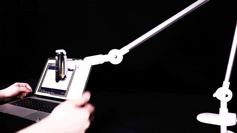 通常のアームの可動域は狭く短い上に、設置できる場所も制限されています。それに対して「GEARM」の可動域は広く、半径約1メートルの範囲を自由に動かすことができます。