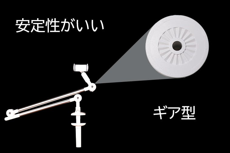 従来のアームは、関節にあるネジを締めることによってアームの位置を固定するものが一般的です。それに対し「GEARM」はギア型の関節を採用している為、従来の5倍以上の支持力を実現しました。