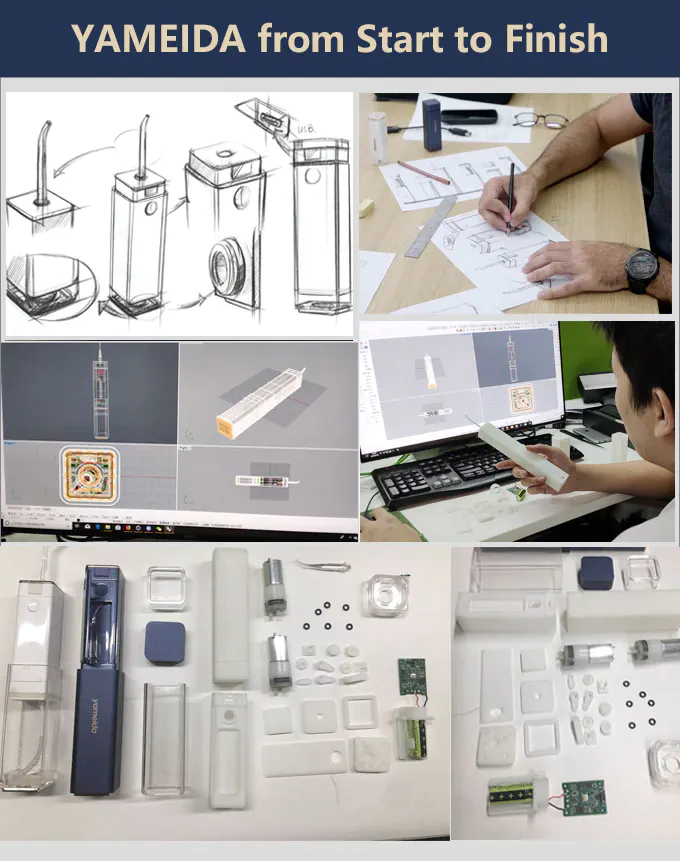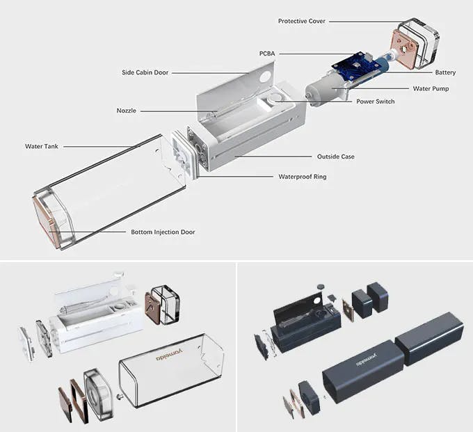 yameidaはコンパクトな口腔洗浄機ですが、中には細かくパーツが入っており、稼働しつつも水で壊れることのないようしっかりとアッセンブリーされています。