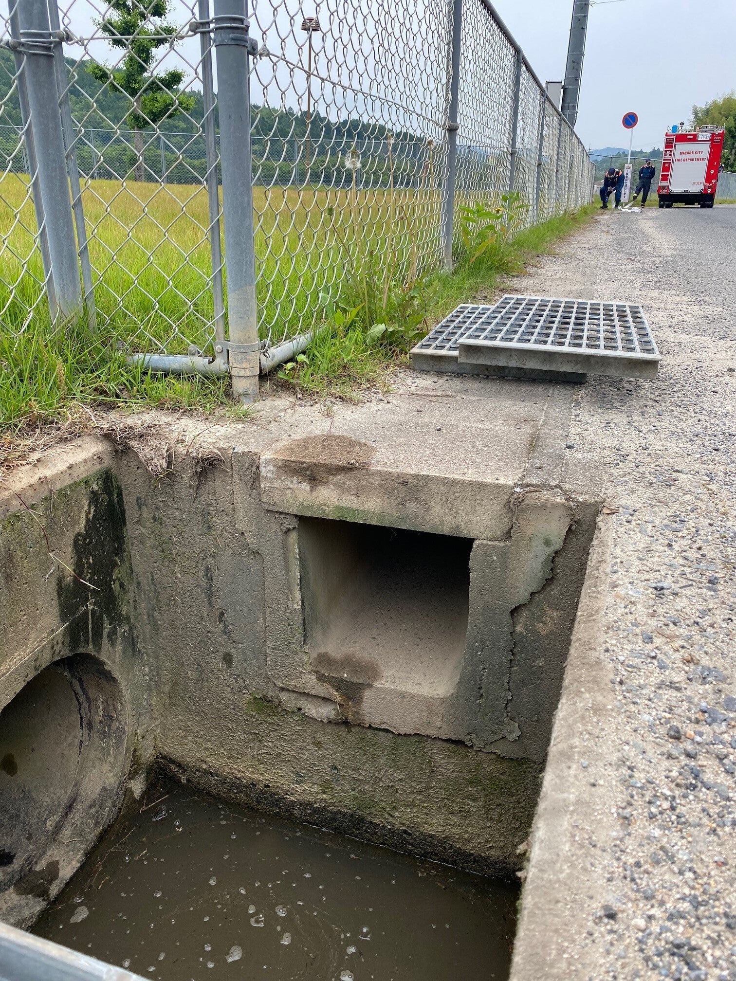 どの排水溝かわからない中、消防車のホースで弱めの水を50M先くらいからちょろちょろと流し、水で追い込む作戦…
