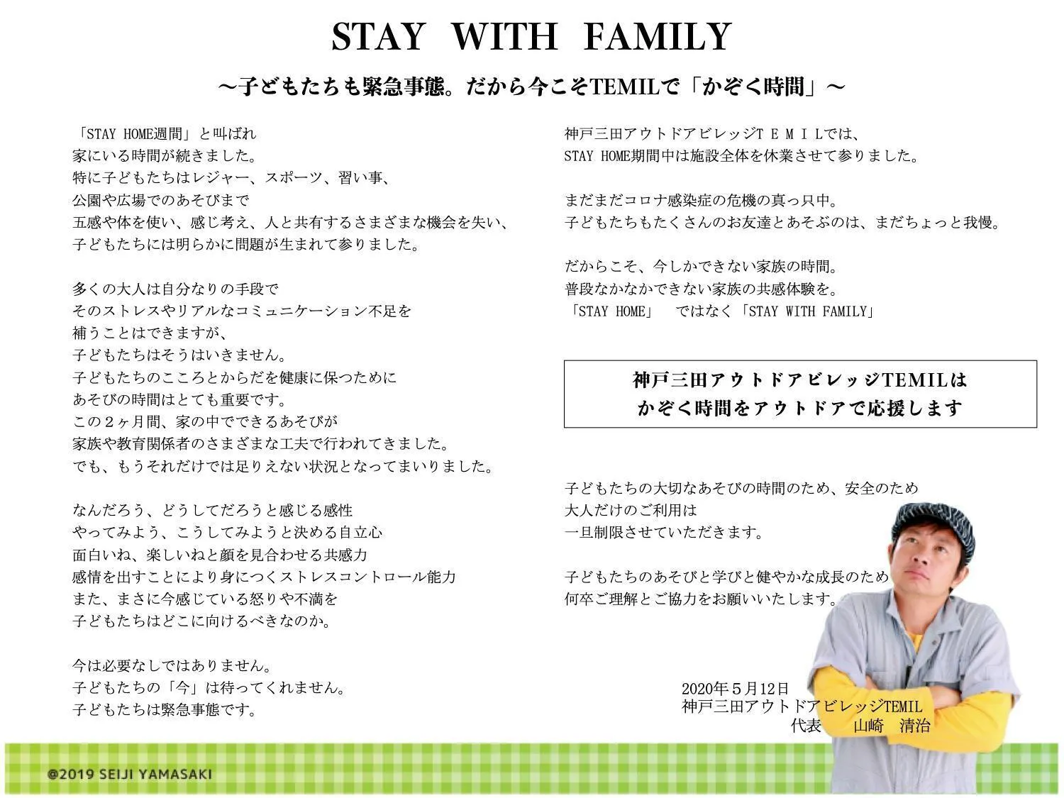その間、私たちスタッフは自分たちにできることは何か…考えることと、動くことを止めず、自分たちにできることとして、TEMILでは「子どもたちのためのキャンプ場宣言」をしました。