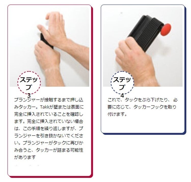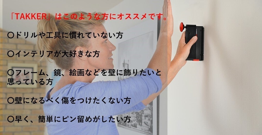 時計、フレーム、絵画を掛ける。または自分のインテリアを部屋に飾り付けるなど、日常生活でピンを打ち込んだり釘を打ち込んだりする作業は思ったよりもシンプルで限定的ですがとてもハードな作業になってしまいます。TAKKERを使えばこれらのハードな作業も女性の力で簡単に行うことができます。