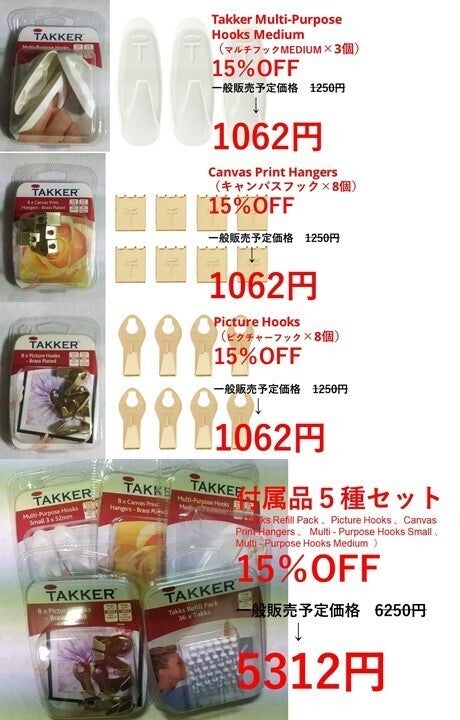 TAKKERは本体とTAK(ピン)、ピクチャーフック、キャンバスフック、マルチフック(スモール、ラージ)で構成されています。