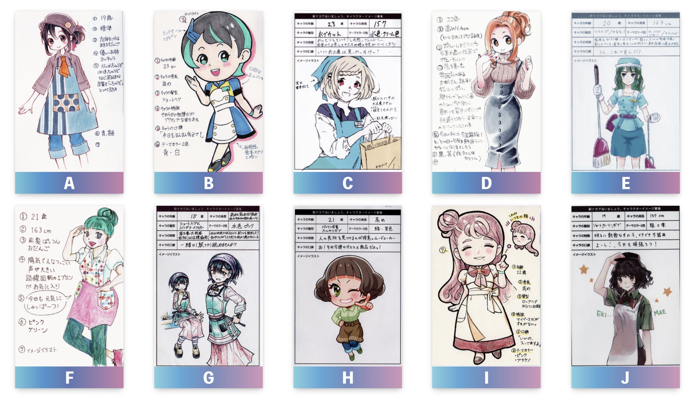 『駅ナカで会いましょう。』応援キャラクター候補10名のイメージから、いくの・くるのと共に今後のプロジェクトを盛り上げていって欲しいキャラクターを1名選んで投票してね!