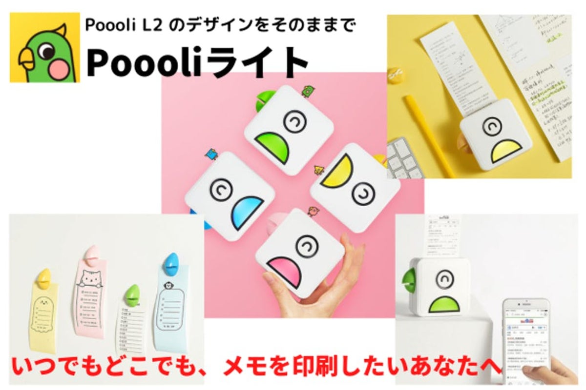 今回のPoooliライトは、従来のPoooli L2のデザインをそのままで、必要最低限の機能とパッケージに絞り込み、価格を下げ、より多くの方にご使用いただけるようにご用意いたしました。出力幅と画像の解像度をやや下げましたが、おなじみのPoooli専用アプリ「Poooliぷりんと」はそのまま利用できるので、利用できる機能は変わらず、テキストをメインにお使いの方はこちらのライトをお勧めいたします。今在学中の学生の方、社会時になったばかりの方も、お気軽にご利用できるようになりました!