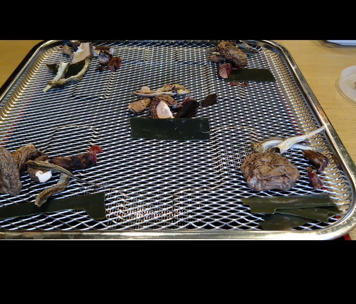 まだまだ駆け出しの出汁ボトル事業。至らない点も沢山あると思います。日本にある旨味をどのように皆様にお届けできるか試行錯誤し今に至ります。今もなお日々研究の毎日です。遠赤外線食品乾燥機により天日干し効能で旨味をギュッと閉じ込め、お醬油や酢など入れて頂いた時から閉じ込められた旨味が少しずつ溢れ出し特別な出汁調味料となります。基本となる心ボトルの国産椎茸、いりこから旨味。真昆布からはトロミが出る事もあり、なまりかつおは1本単位で仕入れるので出汁ボトルに入れる際には砕いてお入れしています。その砕いた、砕きたてと言いますか…切れ口はキラキラと赤く輝きが見えたりもします。