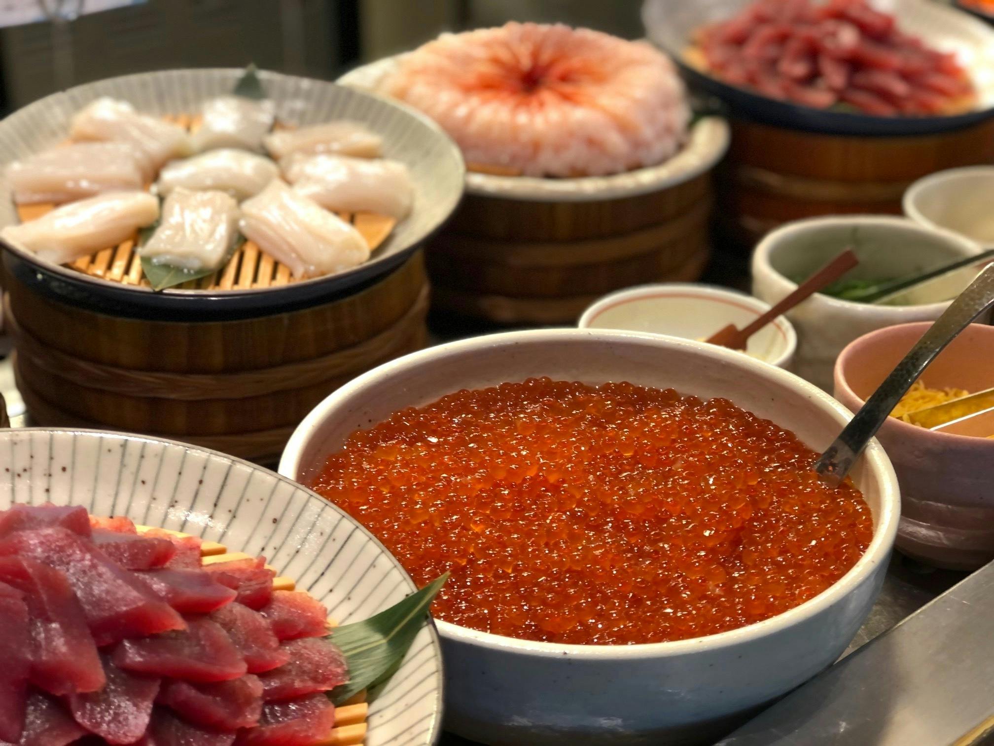 サーモン、マグロ、イカ、イクラ、エビなどの海鮮達