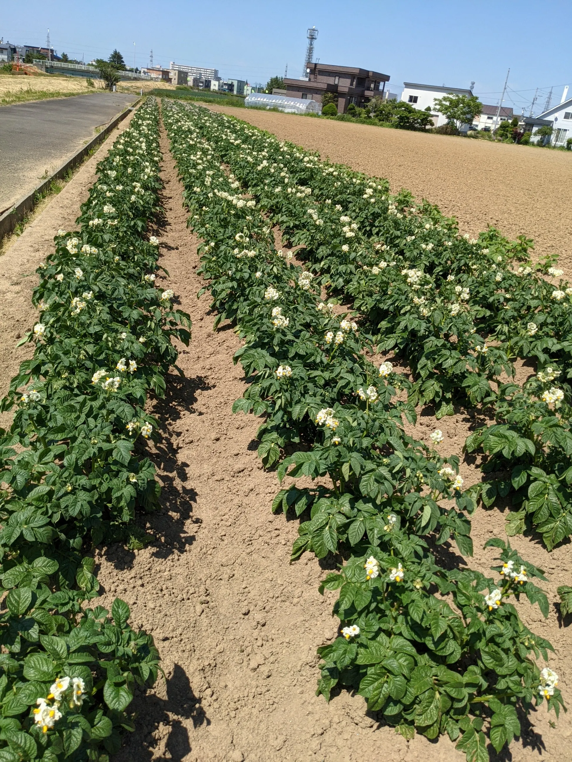 写真では分かりづらいですがとうや、きたあかりは白い花が先メークインはピンク色の花が咲きます。