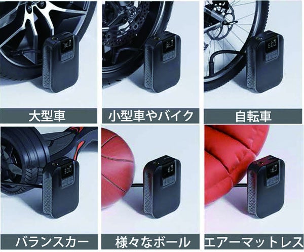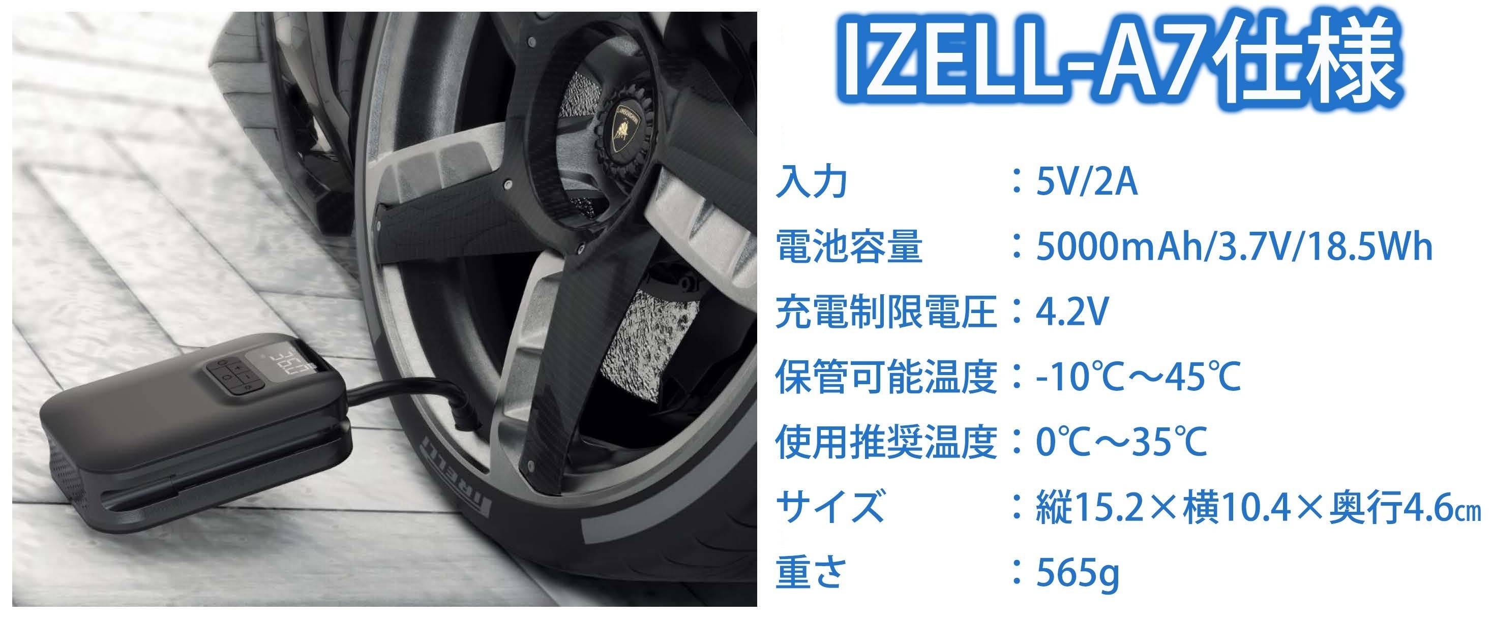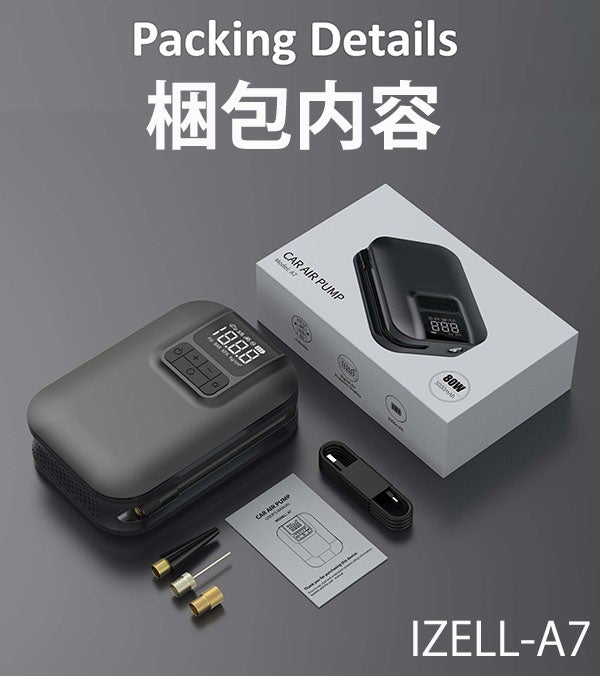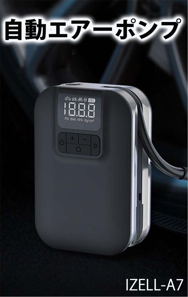 「IZELL-A7」は車、バイク、自転車、その他のタイヤの空気入れ。球技のボールや浮き輪、エアーマットレス等身の回りにある空気入れ製品に自動で空気を入れてくれ、かつ設定した空気圧で自動停止してくれます。