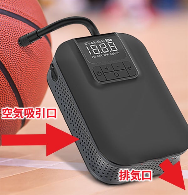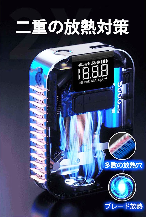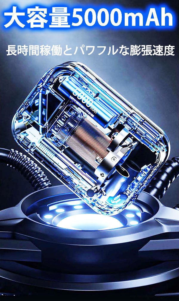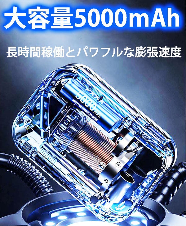 小型設計で持ち運びや収納に便利、5000mAhのリチウムイオン電池とLEDライトが夜間の作業を可能にしてくれるポータブルエアーポンプです。