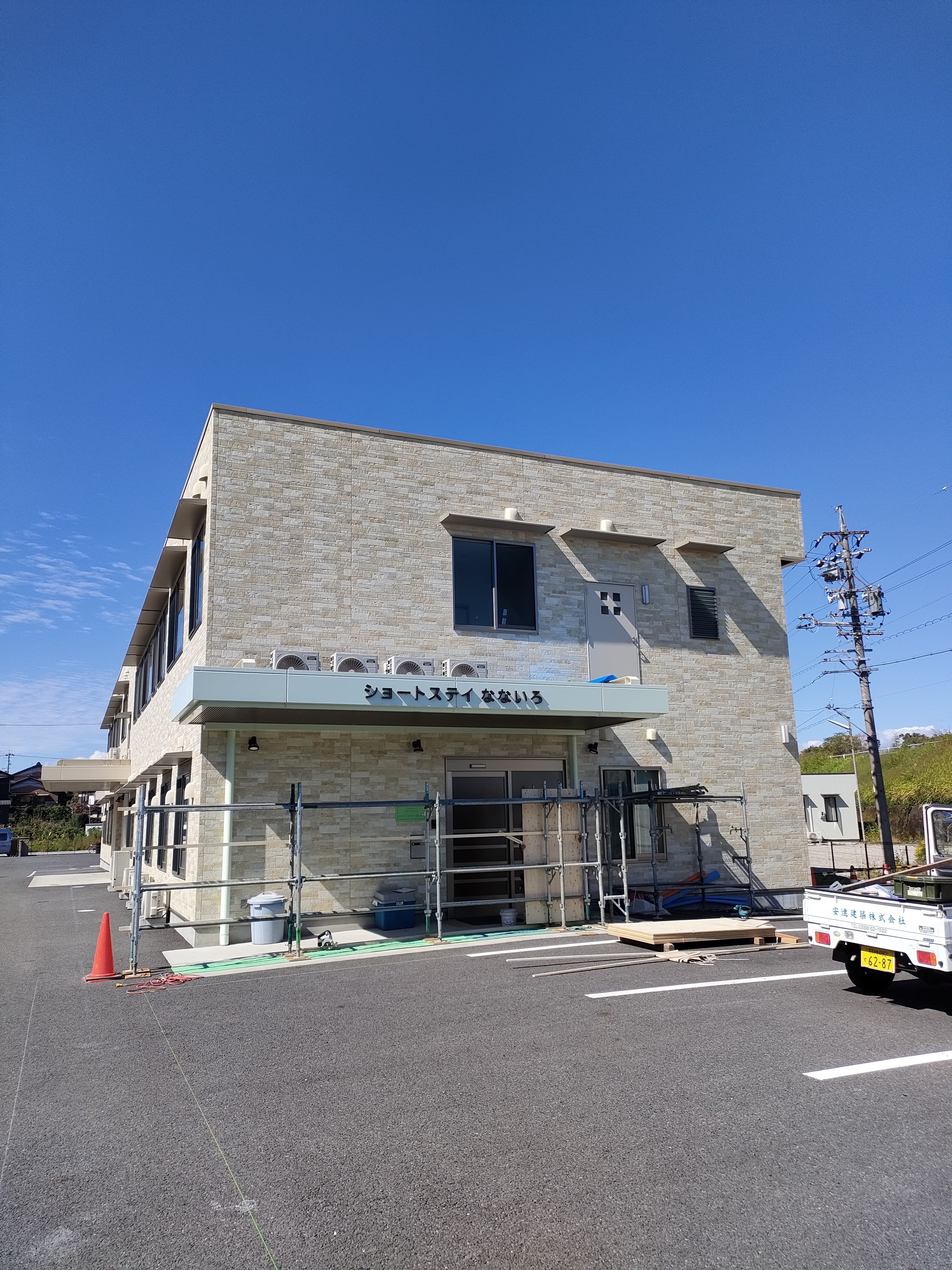 今日、2022年10月15日の一宮市は、気持ちの良い秋晴れとなりました。いよいよ、増築工事が始まりました。今日は、既存の建物との接続部分の処理が行われています。足場が組み上げられ、2階の外階段が撤去されました。建設の状況を、また随時お知らせさせていただきます。