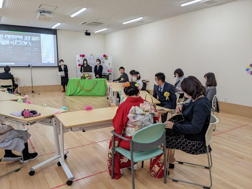 新型コロナ対策の中で、基本は各事業所からzoom参加という形をとり、まーぶるの森、なないろ作業所及びショートステイなないろがある多機能センターぽぷりの多目的ホールに新成人の方々にお越し頂きました。きそがわ福祉会の通所部門を利用されている新成人の方は今年は7名です。