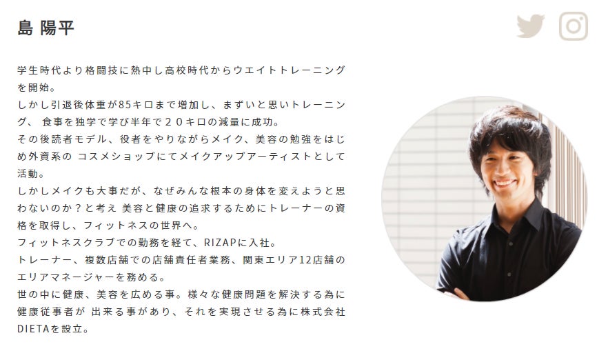 また「ダイエットパートナー」では、最大手パーソナルジムRIZAPにて複数店舗での店舗責任者業務、関東エリア12店舗のエリアマネージャーを務められた「島陽平」様をプログラム監修者に迎え入れることにより、低価格でもきちんと痩せる"ダイエットメソッド"を導入。