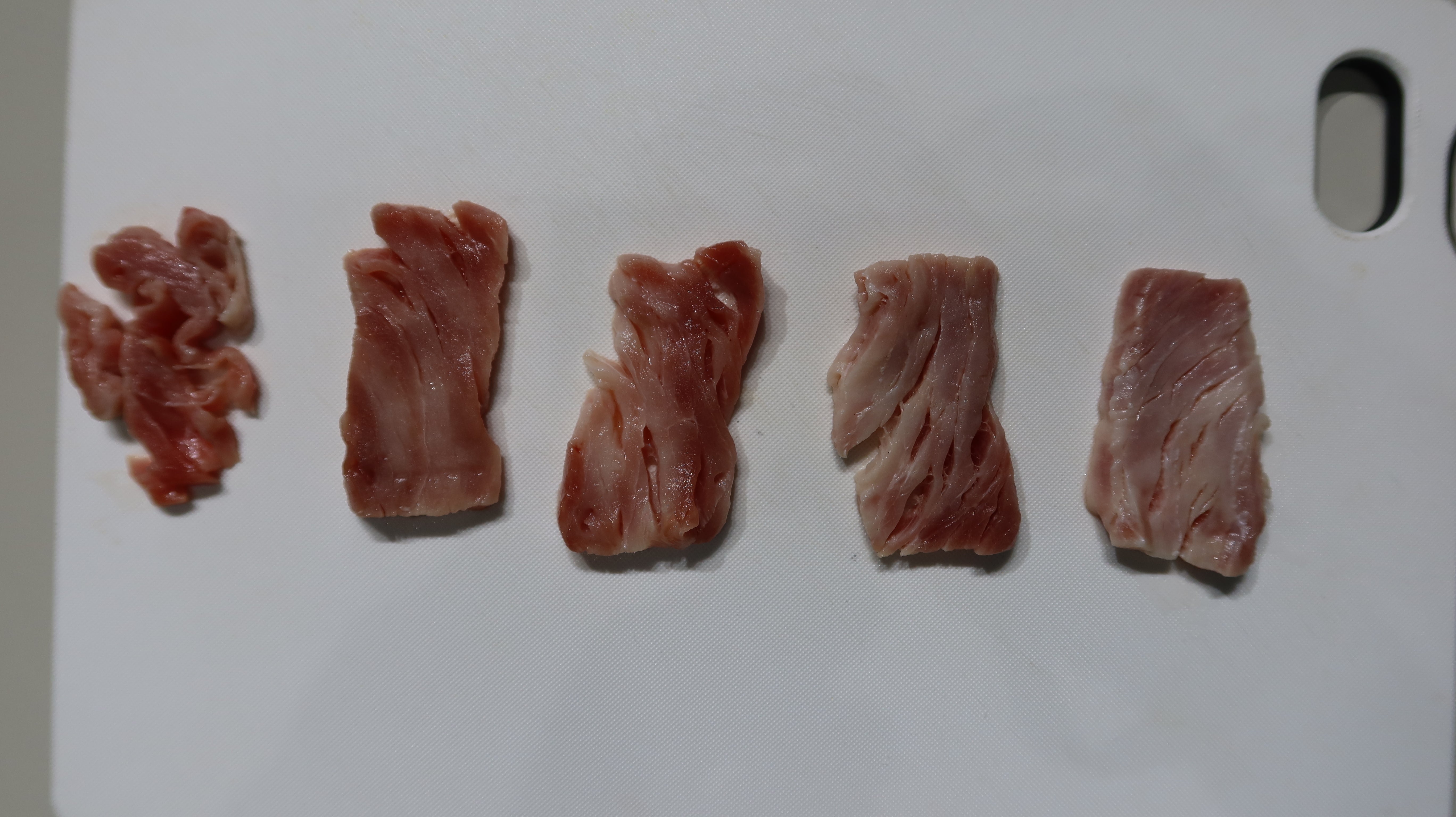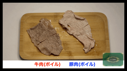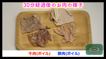 *茹でた牛肉と豚肉をパパイヤ粉末で溶解実験(溶ける変化)しました。