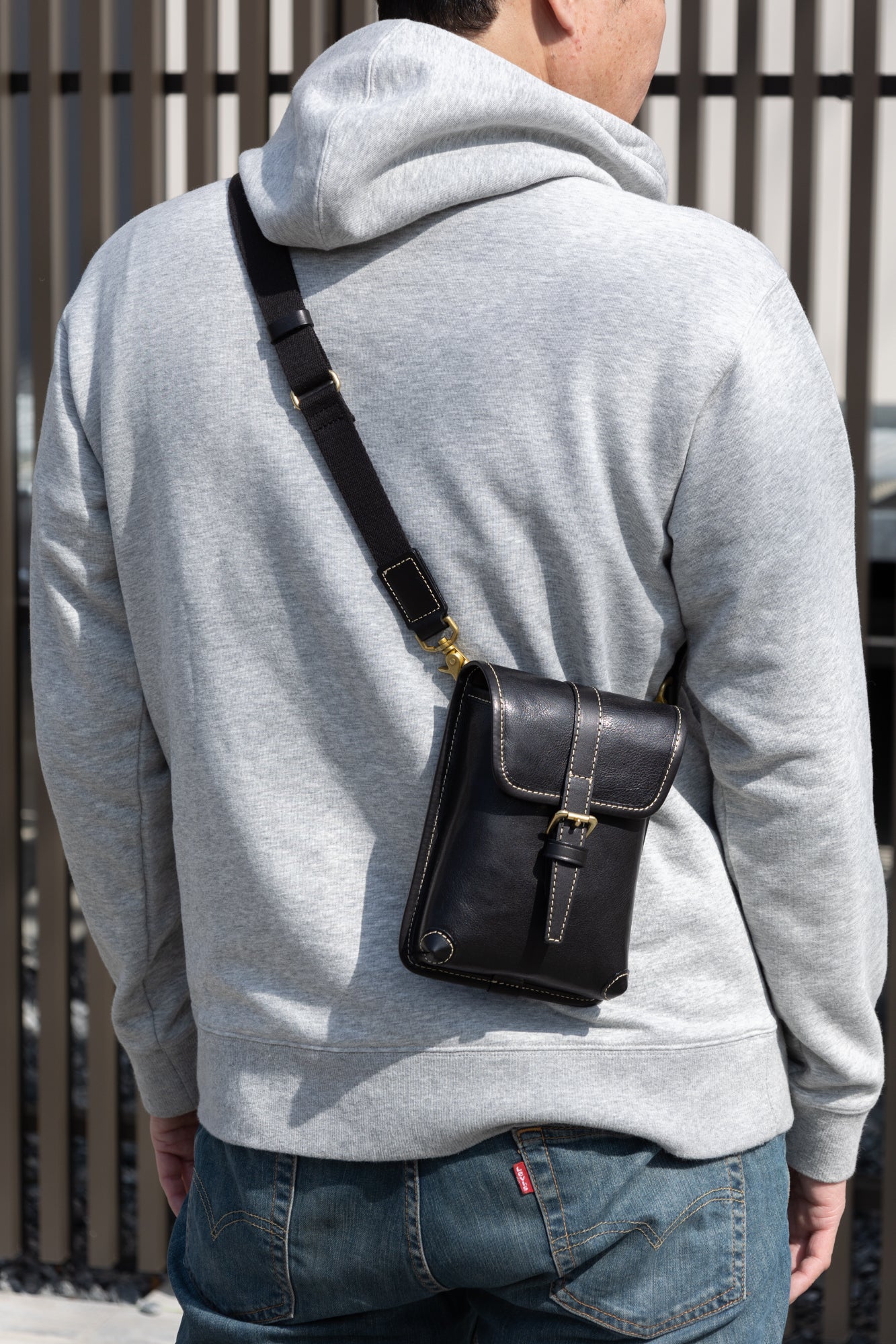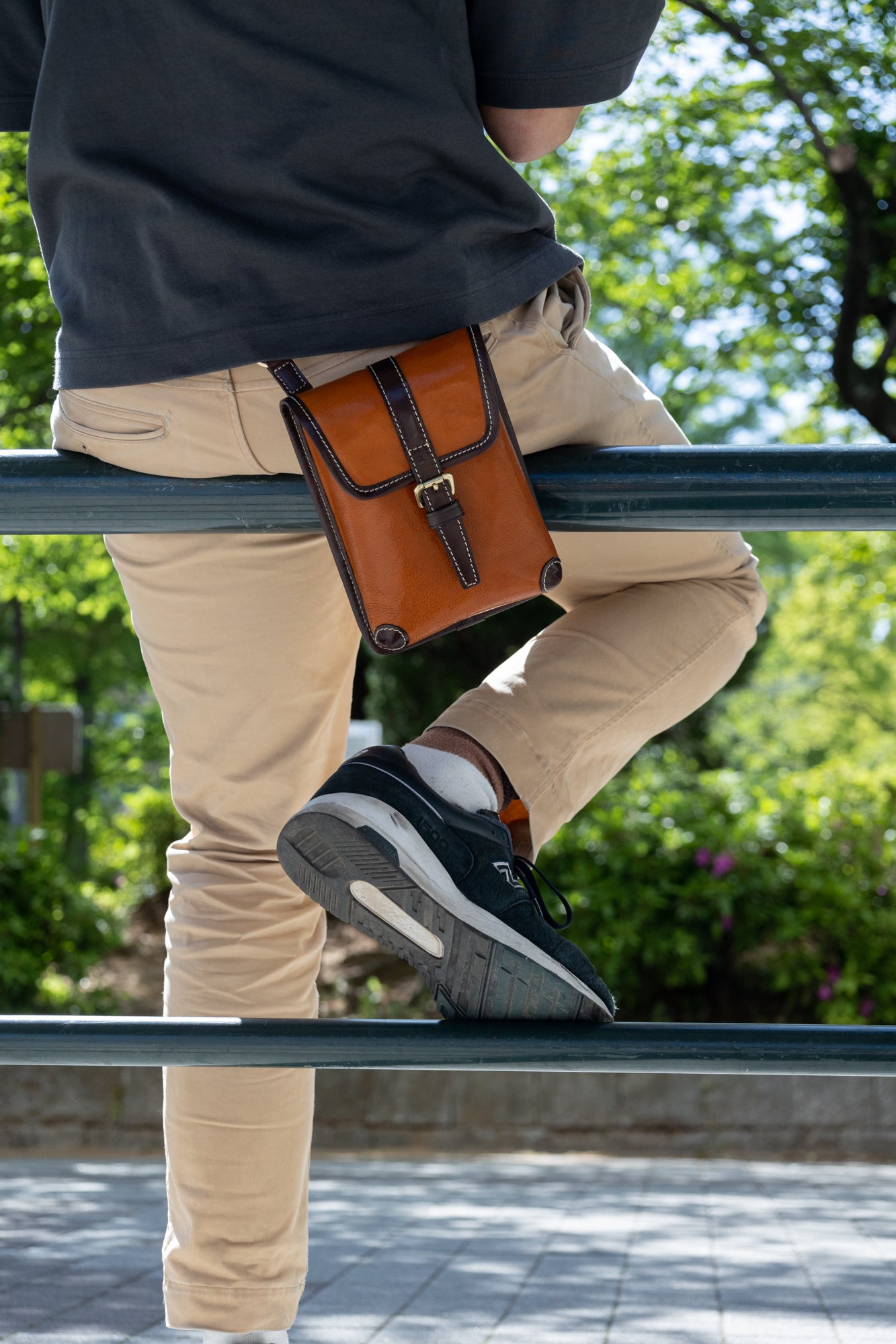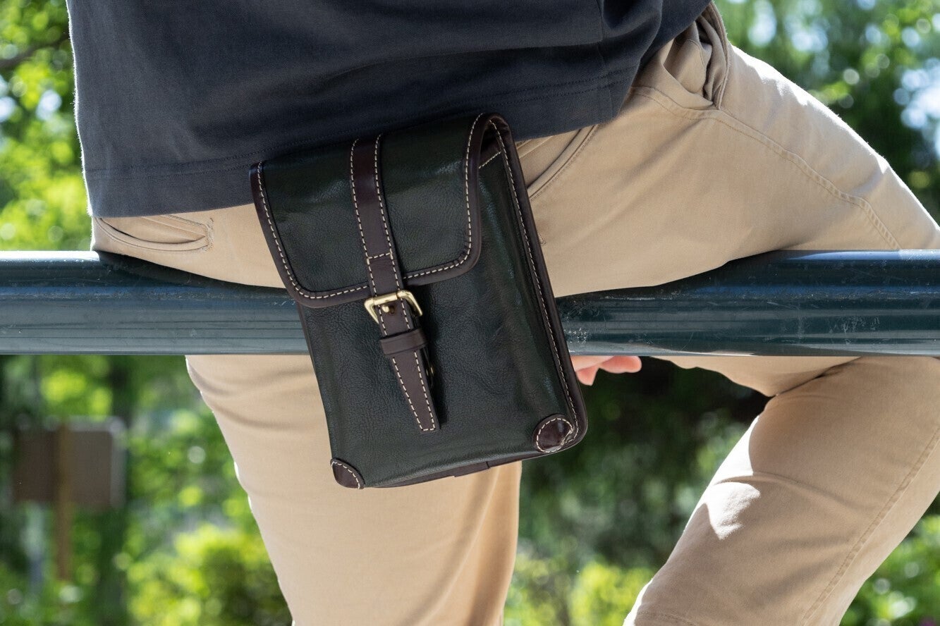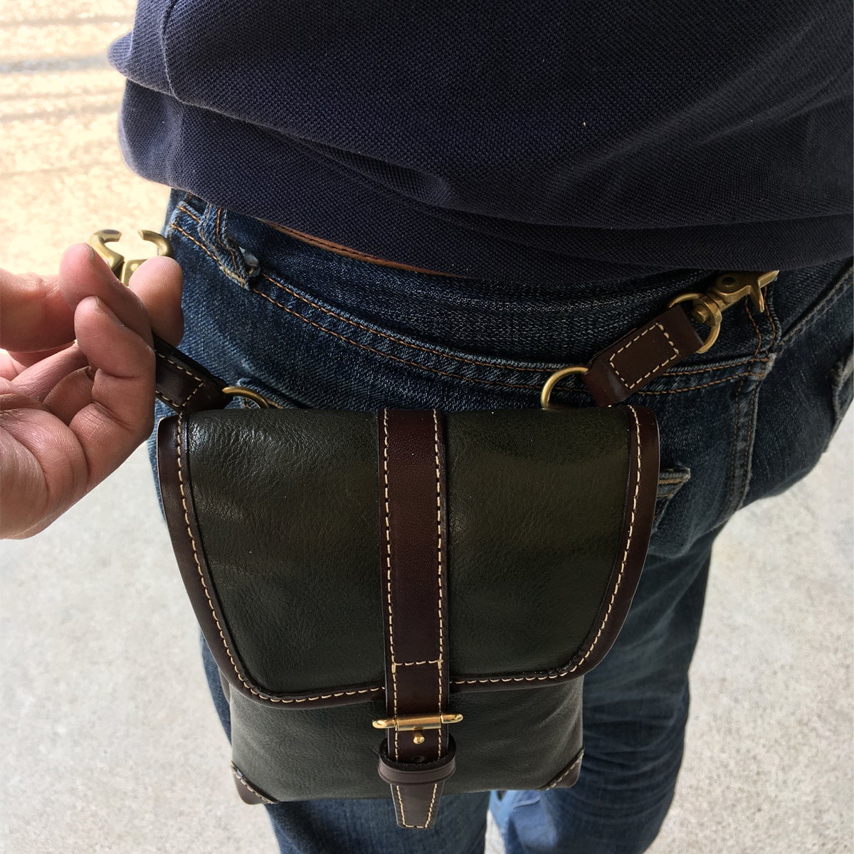 鞄の根元の革(根革)にはDカンを付けています。Dカンがある事で根革が左右に動き、可動の役割を果たします。ベルトループの幅を気にせず、お手持ちのズボンに取り付ける事が出来ます。