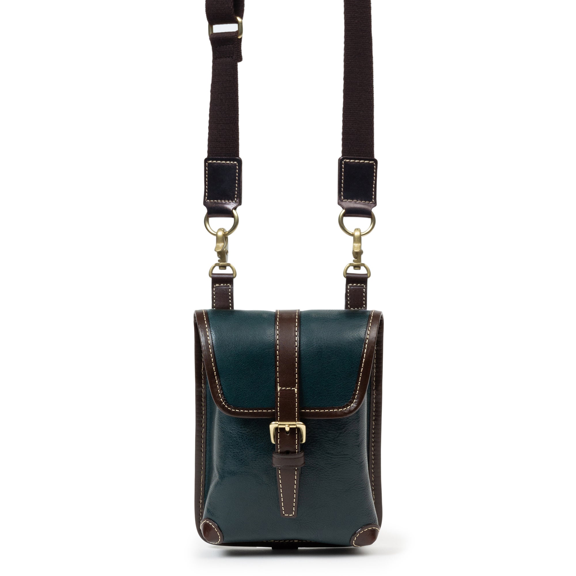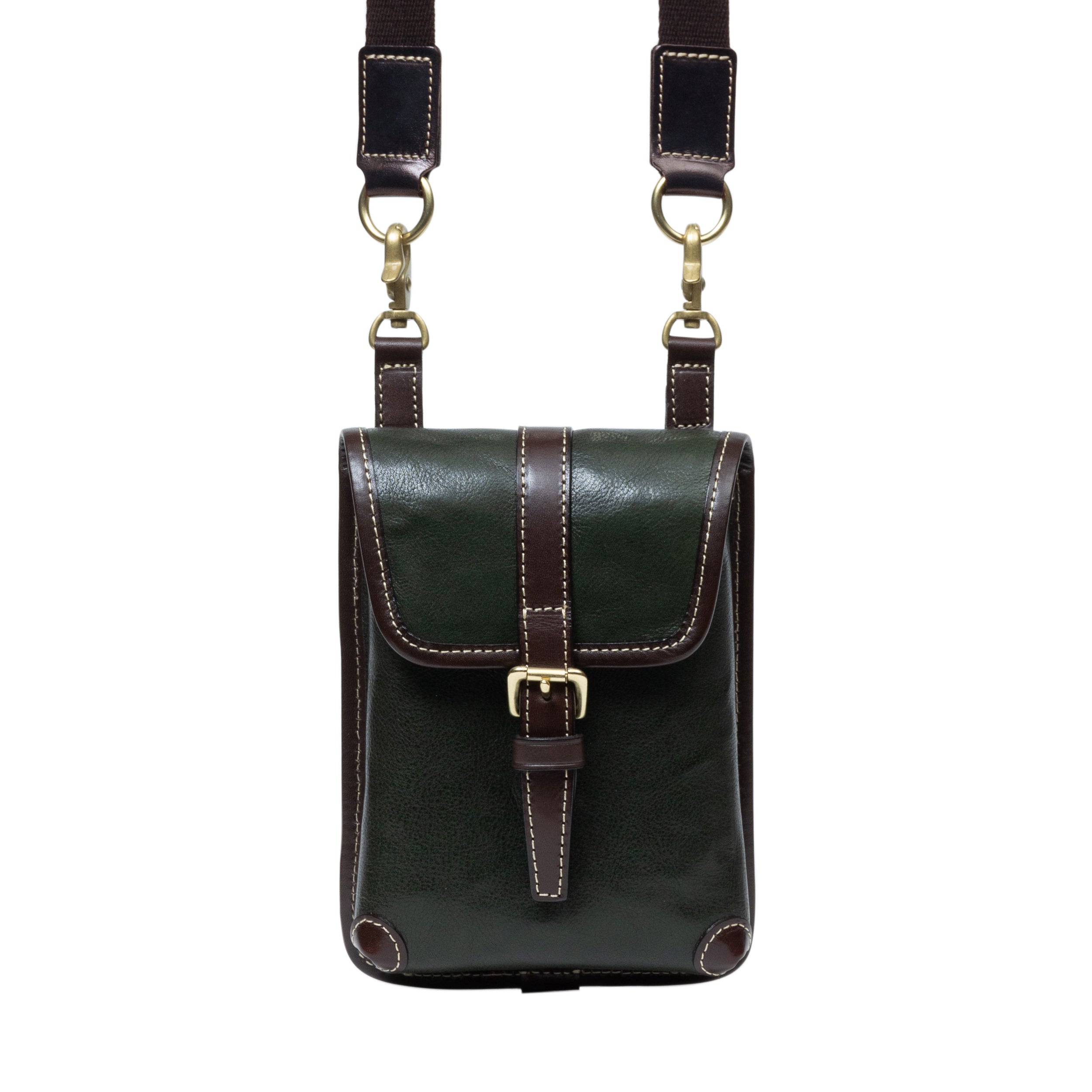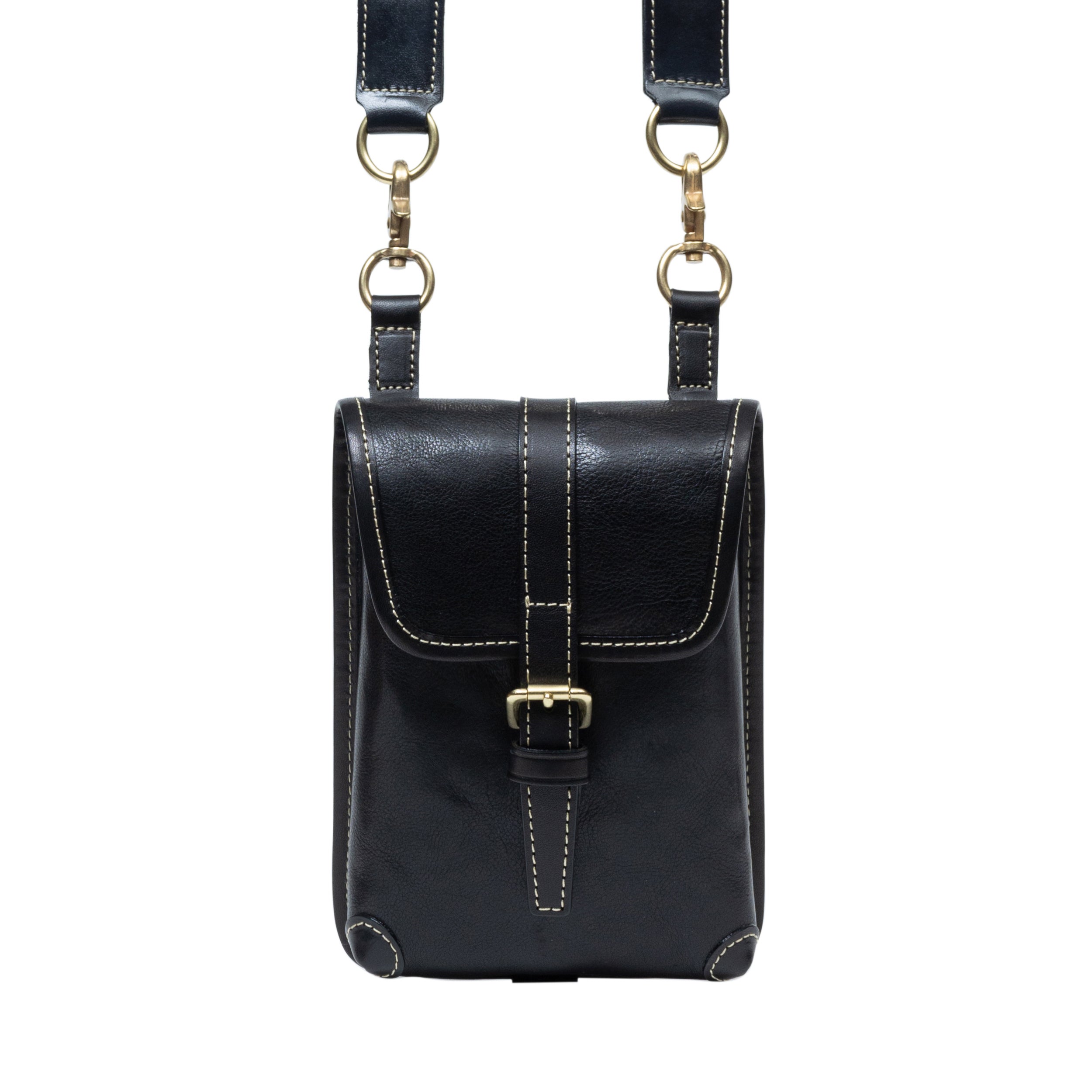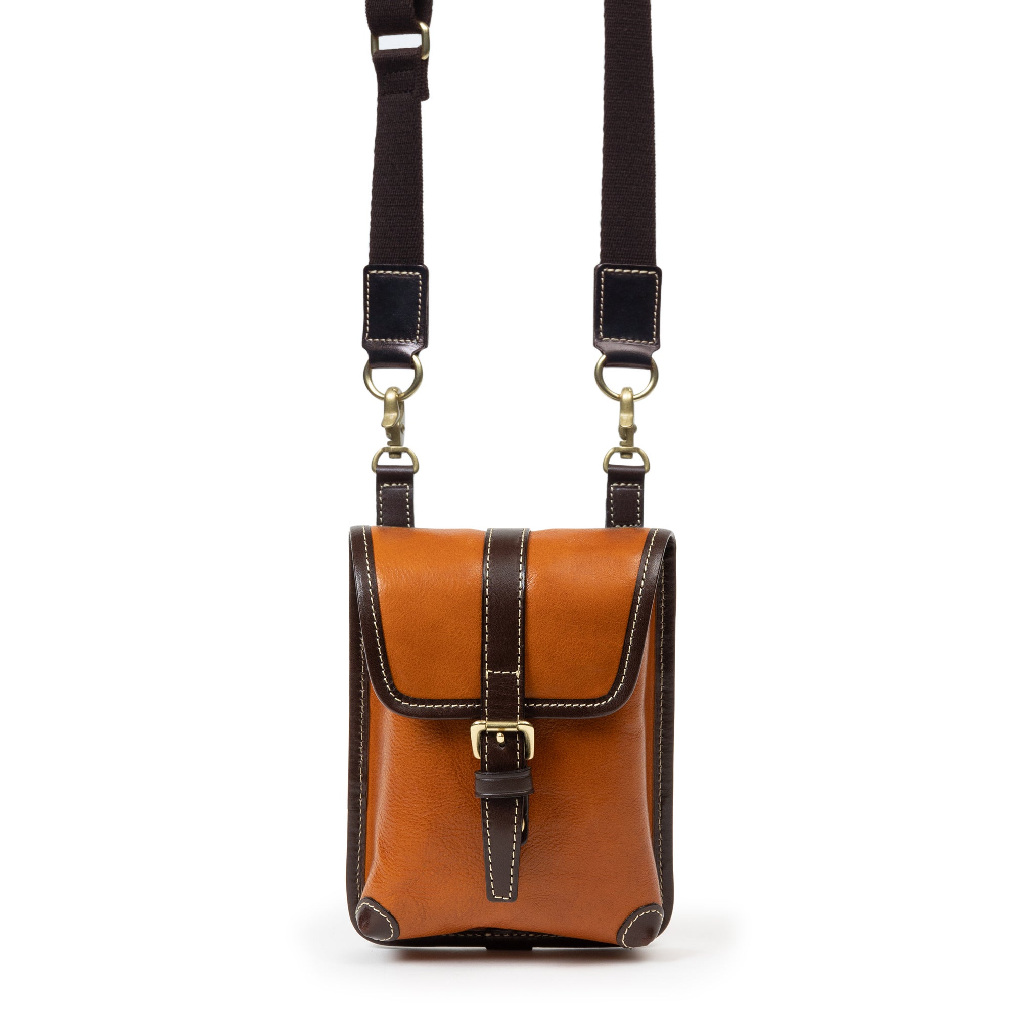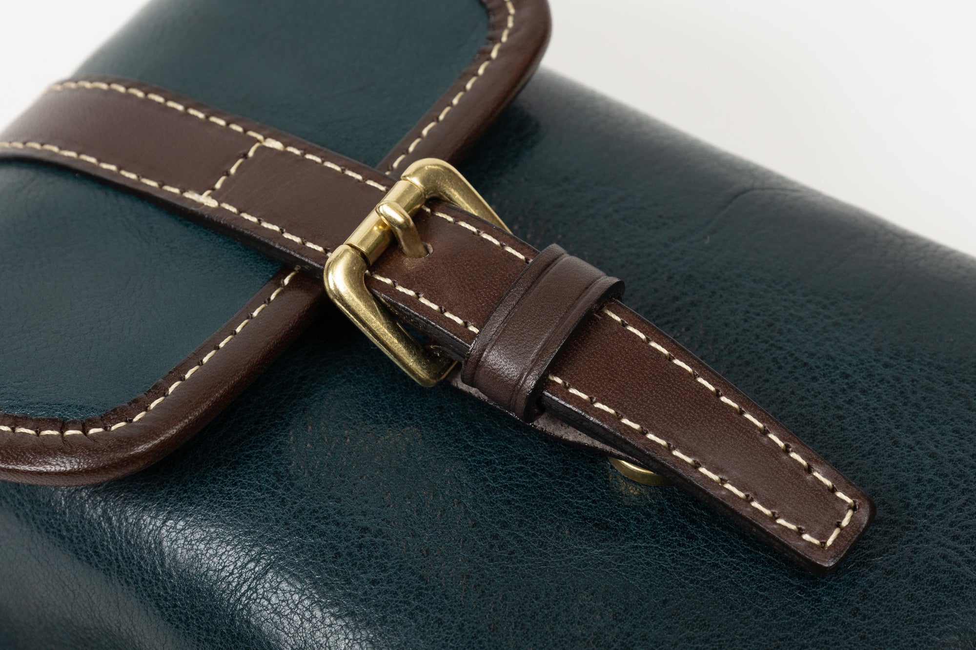 鞄の根元の革(根革)にはDカンを付けています。Dカンがある事で根革が左右に動き、可動の役割を果たします。ベルトループの幅を気にせず、お手持ちのズボンに取り付ける事が出来ます。