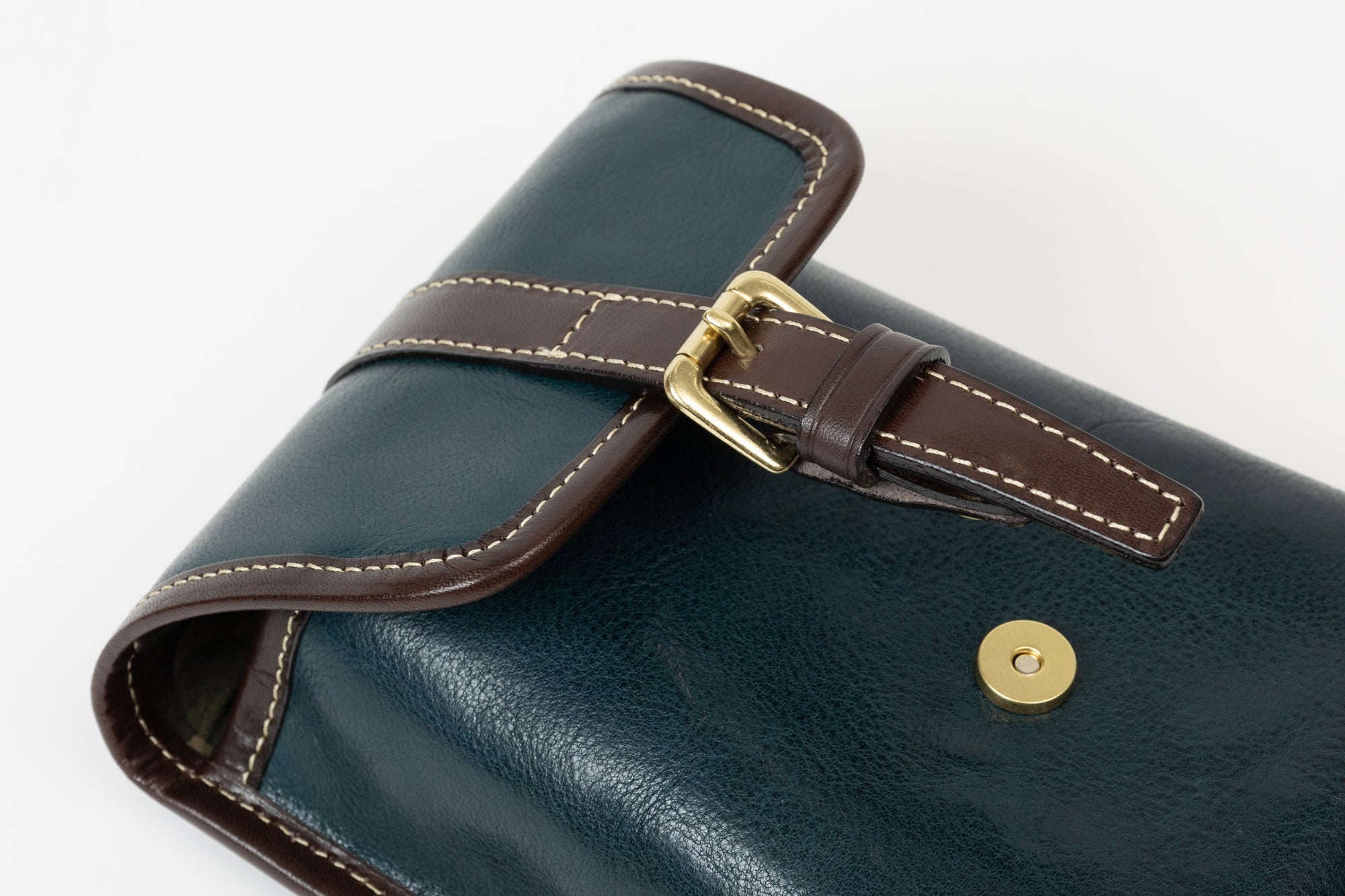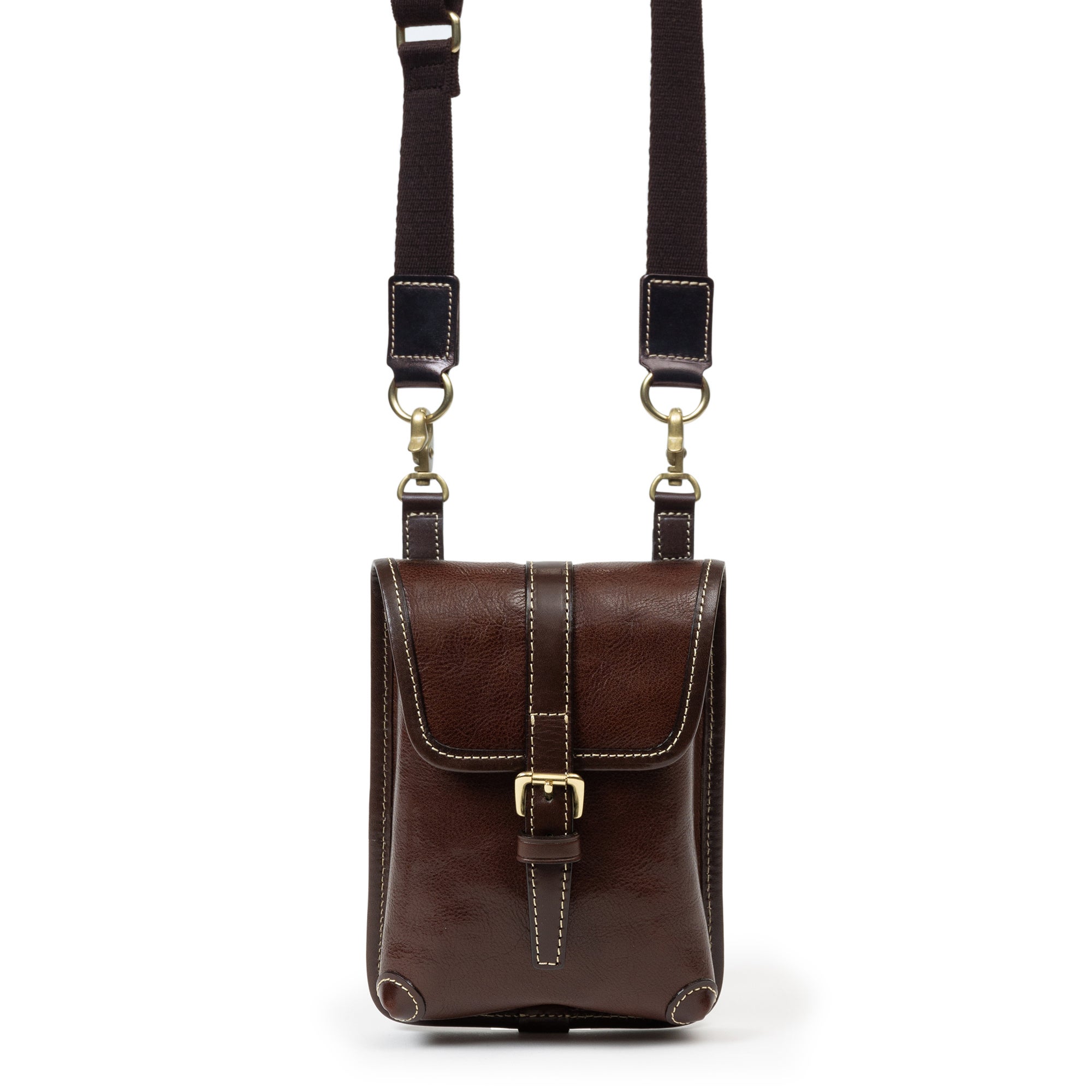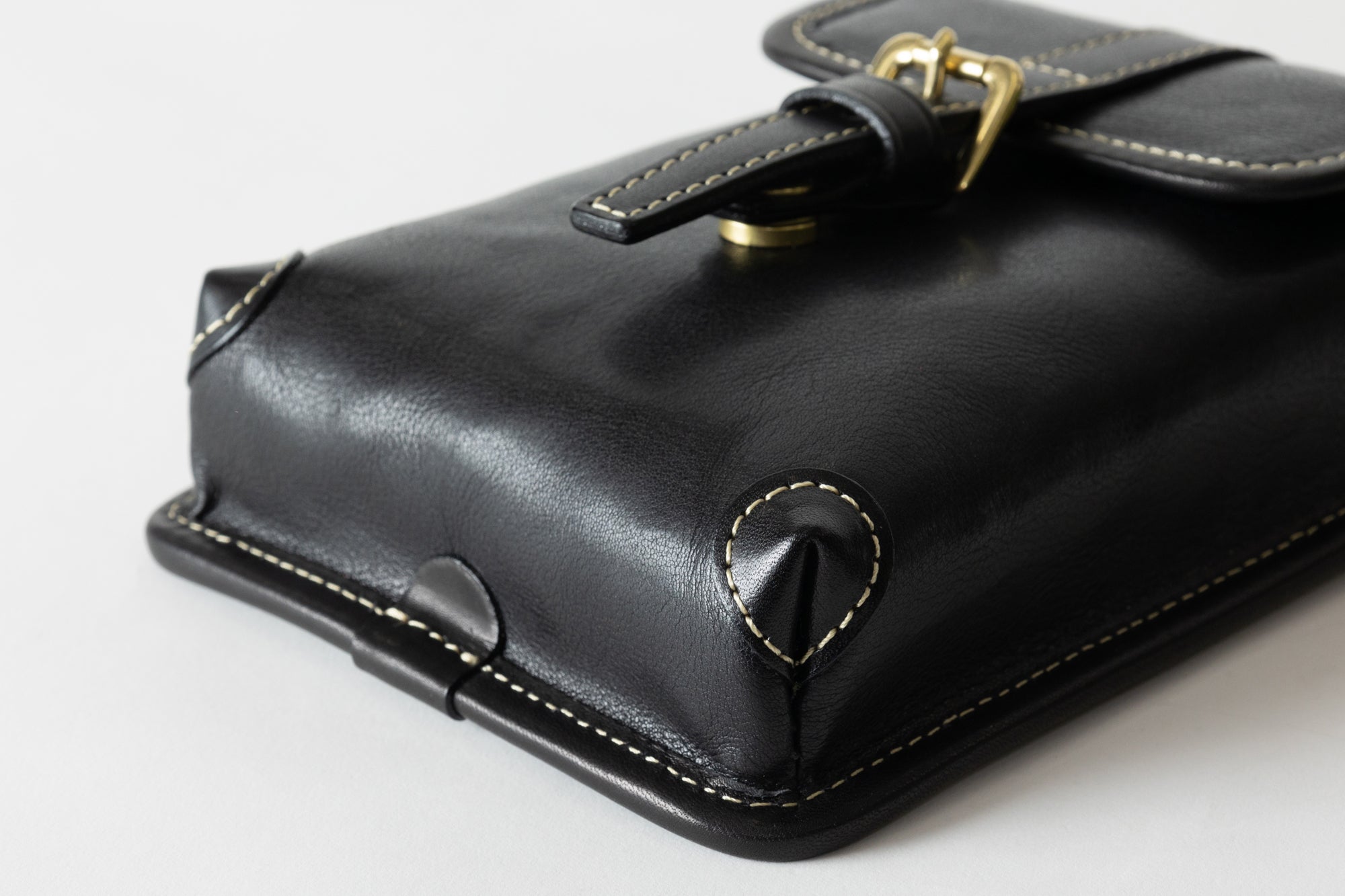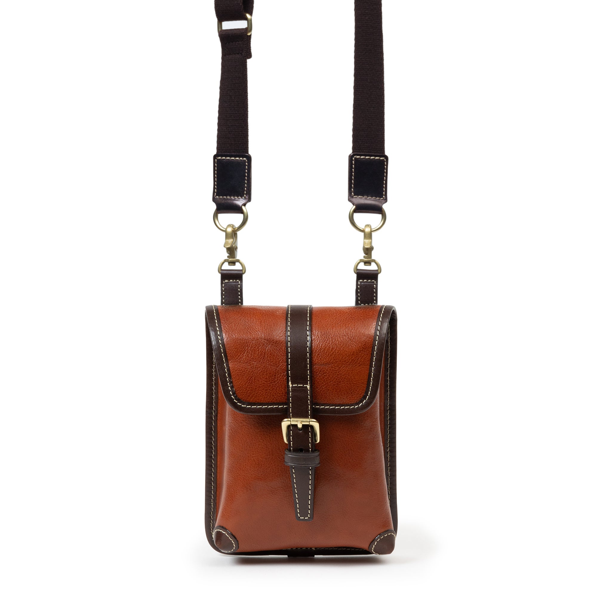 鞄の根元の革(根革)にはDカンを付けています。Dカンがある事で根革が左右に動き、可動の役割を果たします。ベルトループの幅を気にせず、お手持ちのズボンに取り付ける事が出来ます。