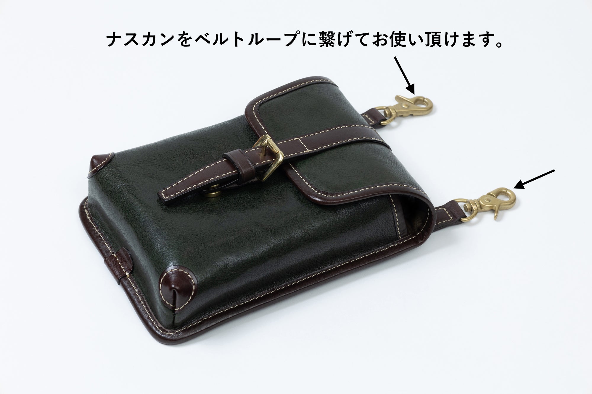 鞄の本体側にナスカンが付いているので、ベルトループに取り付けてウエストバッグとしてお使い頂けます。