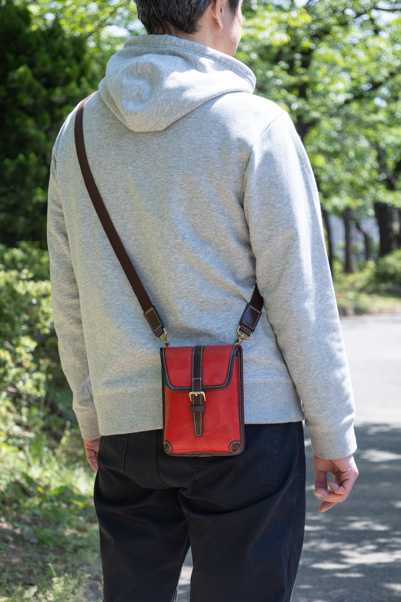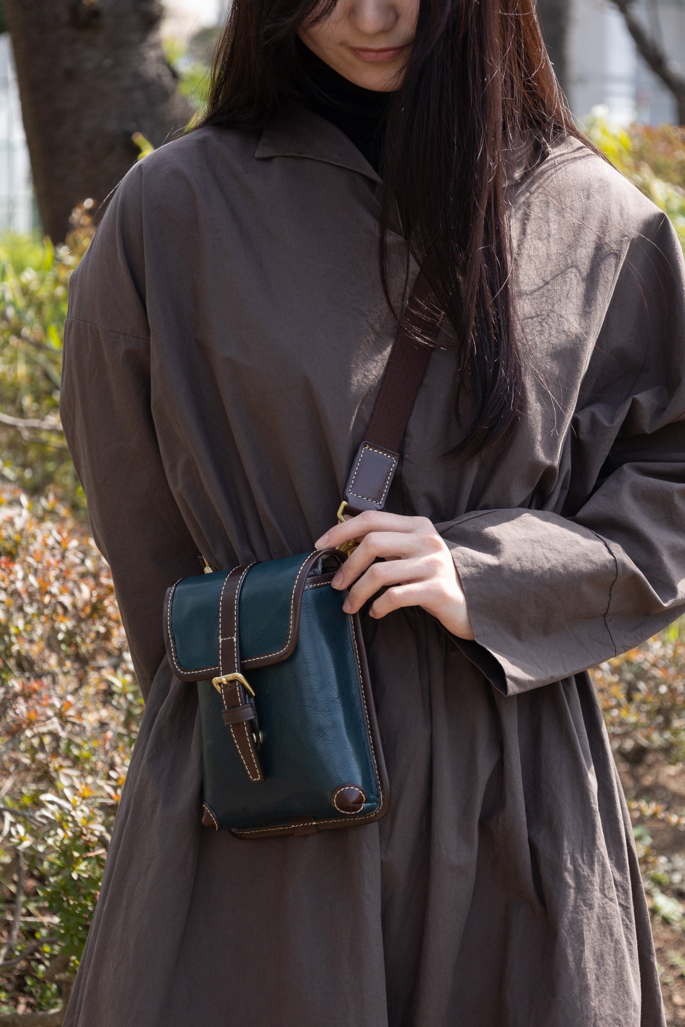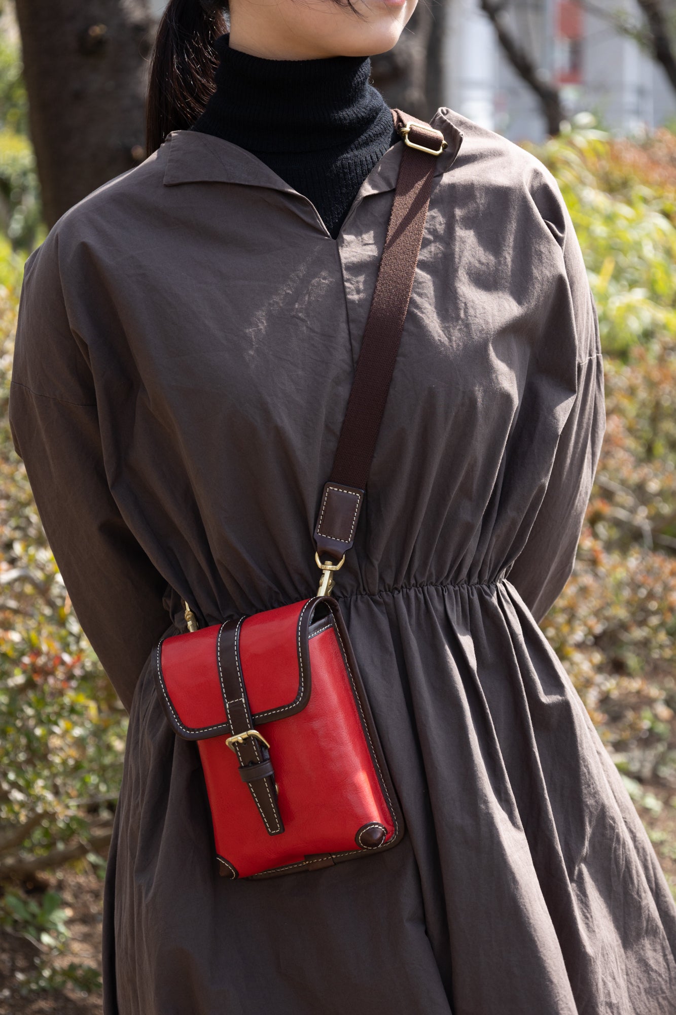 短めに胸の前でかけたり、長めにして腰にかけたり様々な持ち方がお楽しみ頂けます。