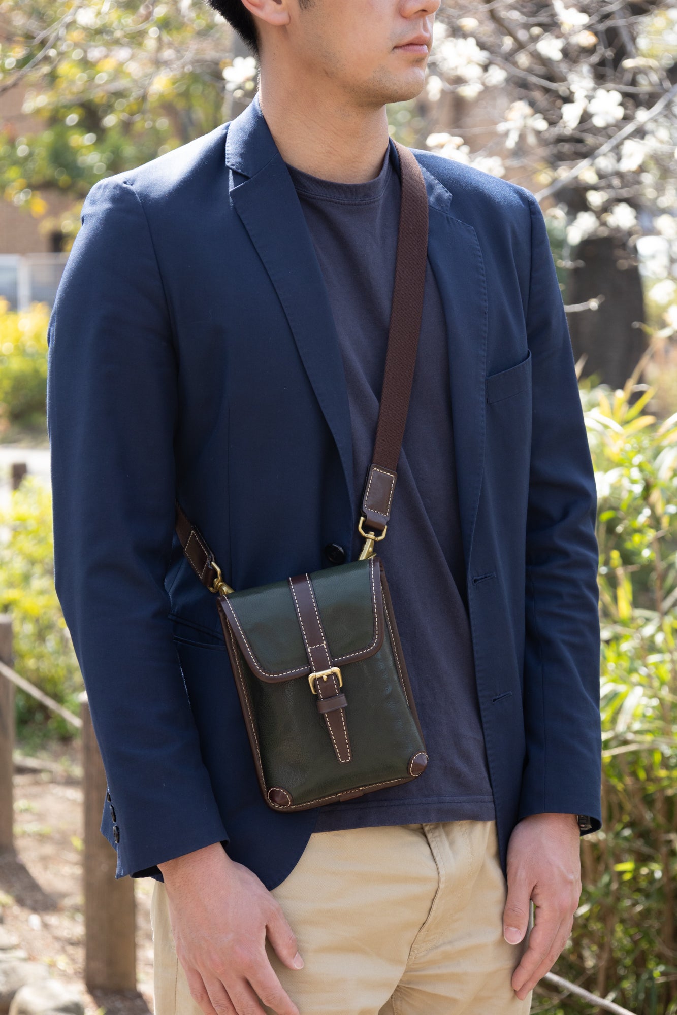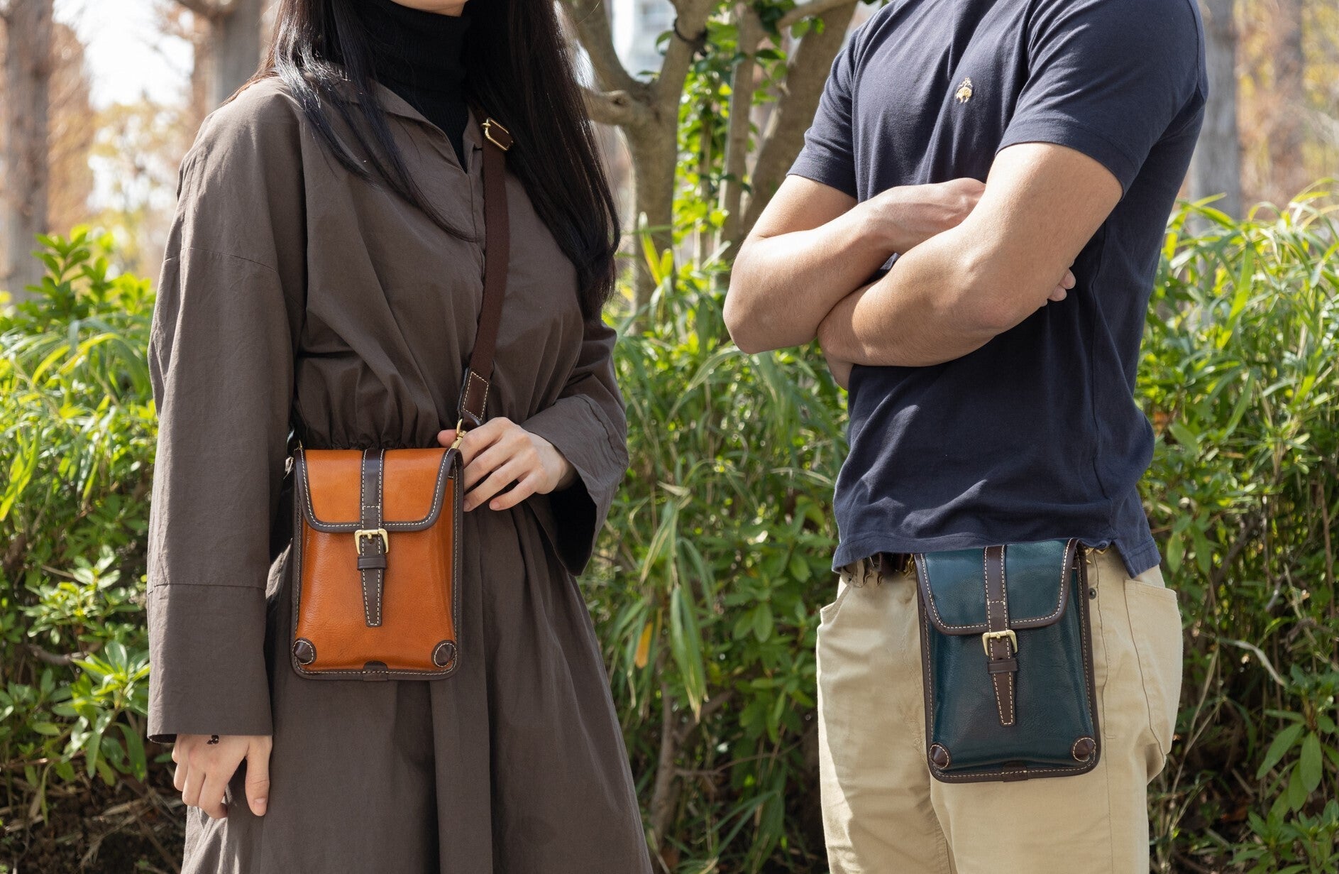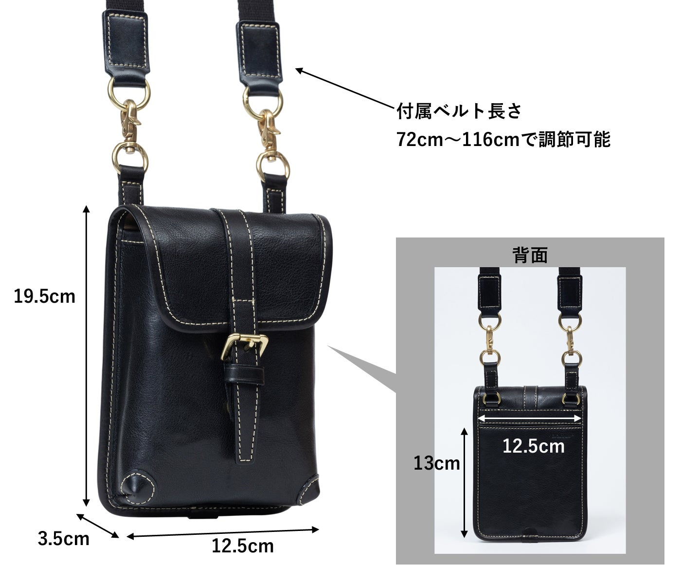 短めに胸の前でかけたり、長めにして腰にかけたり様々な持ち方がお楽しみ頂けます。