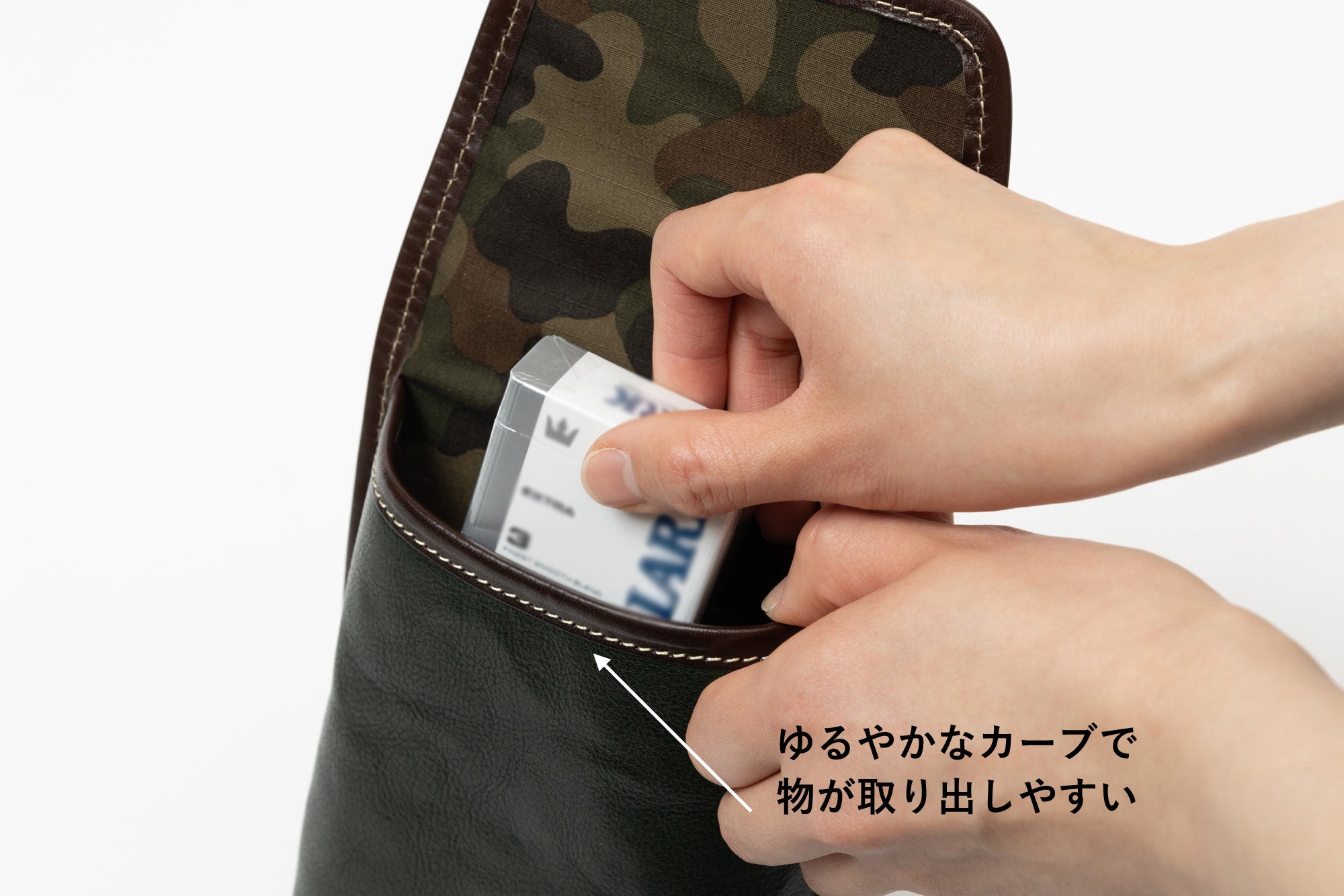 さらに口元も直線ではなく物が取り出しやすい緩やかなカーブ形状にへこませています。
