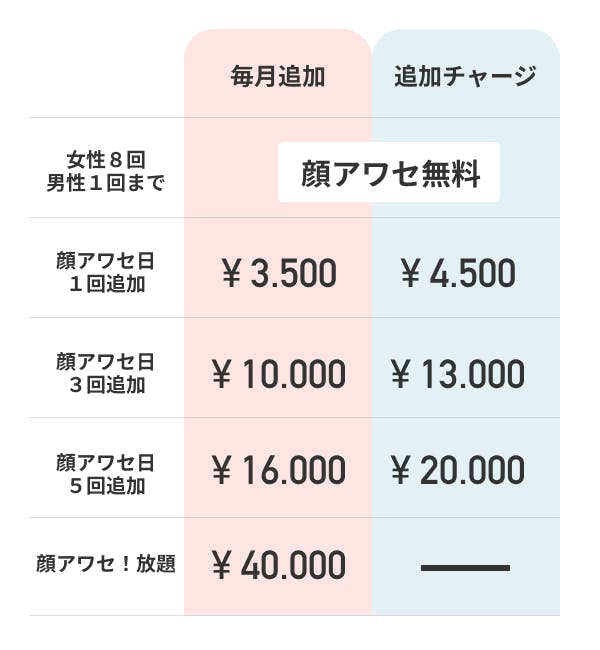 料金はチャージ式の顔アワセ回数分だけの定額で、チャットやアクセスごとに追加チャージを求めることは一切ありません。