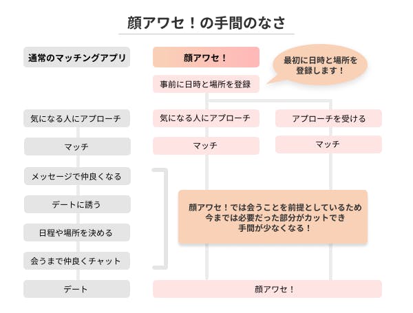 顔アワセ!では、同じ日時を登録している人からマッチングします!なので、チャットのやり取りが不要になります。忙しいときでも、「はじめまして」は大切に。