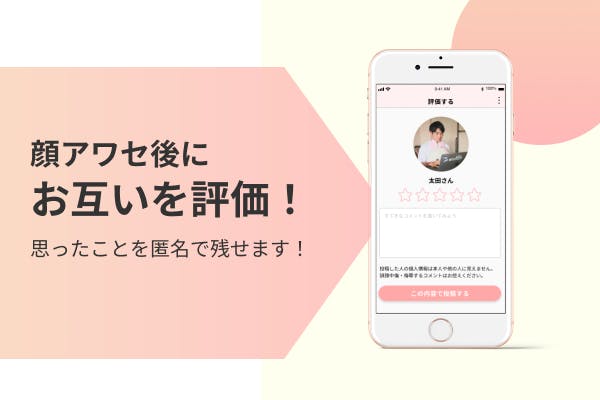顔アワセ!が終わった後、相手のことを評価できます。相手の過去の評価から、「会っても大丈夫な人か」をより詳しく判断できます!過去に顔アワセした人からの意見って信頼感抜群ですよね。