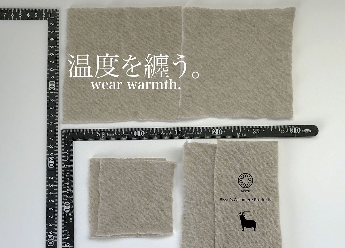 こんにちは!Bisyu'sです。『温度を纏う。・・・プロジェクト』今日はBisyu's カシミヤの軽さと暖かさについて、お話したいと思います。その前に以前、Bisyu's カシミヤ素材と他素材との比較検証を行った時のデータを。最初に、それぞれ異なった代表的な素材を集めました。画像左から、1、 COTTON 100%裏毛 ・スエットトレーナー素材。30/10のベーシックタイプ。2、Cashmere-Productsの吊り天竺カシミヤ尾州仕上げ素材。3、COTTON 100%ワッフル ・Tシャツによく使われている素材。4、COTTON 100%ボーダー天竺 ・Tシャツによく使われている素材。5、リネン100%織物 ・リネンブラウスやワンピース等に使われているタイプ。検証方法条件 ・各素材10cm×10cmで切りそろえてカット。検証一:四つ折りにしてのボリューム比較検証二:各素材10㎠の重さ ※小数点はカット。▷結果検証一 : UP画像の通り。ほぼスエットと同じボリュームです。検証二 : 裏毛4g・Bisyu'sカシミヤ1g・ワッフル2g・天竺3g・リネン2gBisyu'sカシミヤ・・・なんと1g と出ました!! ダントツの最軽量でした。※計量器が1g以下が表記されない為、厳密に言うと、実際は1.4~1.6gといったところでしょうか・・・ボリュームは、スエット裏毛とほぼ同じでしかも軽い=空気層があると言うことになります。カシミヤの高保温性の要因はこんなところにも証明されていますね。さて、朝夕に、元気になく虫の声で秋の訪れを感じる今日この頃です。カシミヤアイテムは、寒い冬の日はもちろんですが、意外と初秋にもご使用頂くと便利なんです。日中あったかい時は、コートやジャケットなど邪魔になる時もあって、できれば薄手のカーディガンくらいで外出したくなりますよね。そんな時、BAGの中に、ネックウエアーアイテム1枚入れておくと安心。首回りをバッチリあっためてくれますので、少々の寒さもなんのその!大活躍間違いなしです。これから秋冬に向け、季節の変わり目です。時節柄、お体ご自愛くださいませ。引き続きご支援の程、よろしくお願いします。Bisyu's