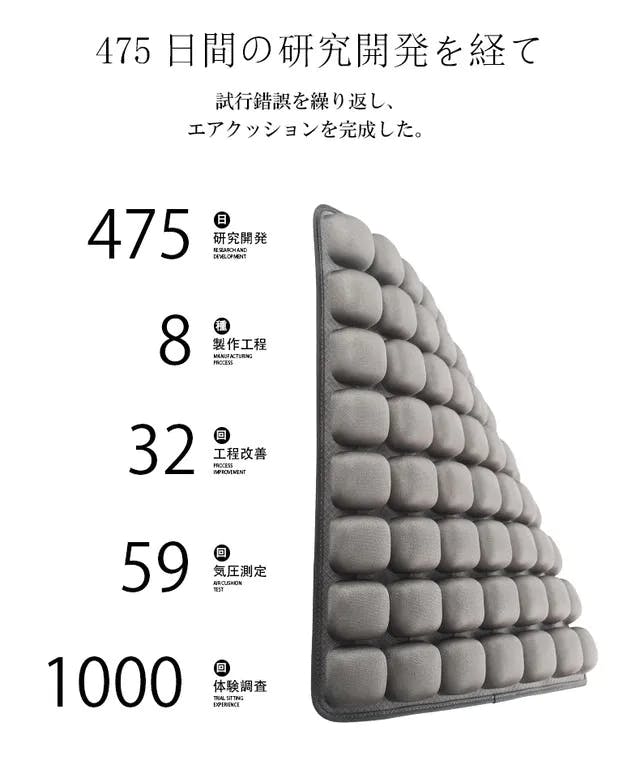 そこで私たちは、8時間座っても快適、楽々で、正しい姿勢を維持し、お尻にフィットする3Dエアクッションを開発しました!