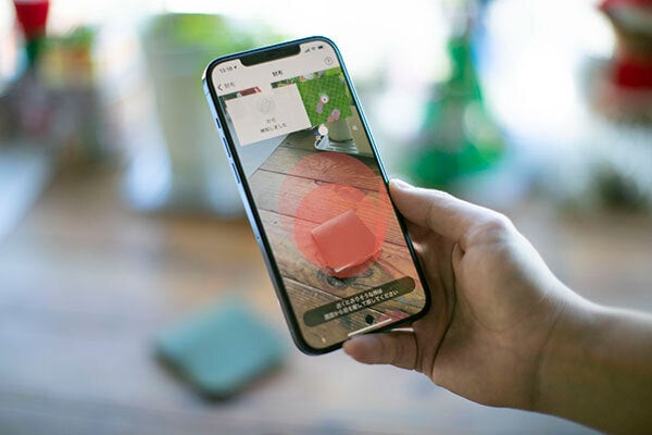 「カメラで探す」とは、ARを活用した、MAMORIOを探すための機能となります。「カメラで探す」を利用することにより、近くにあるのがわかっているがMAMORIOが見つからない時に、発見をお手伝いします。