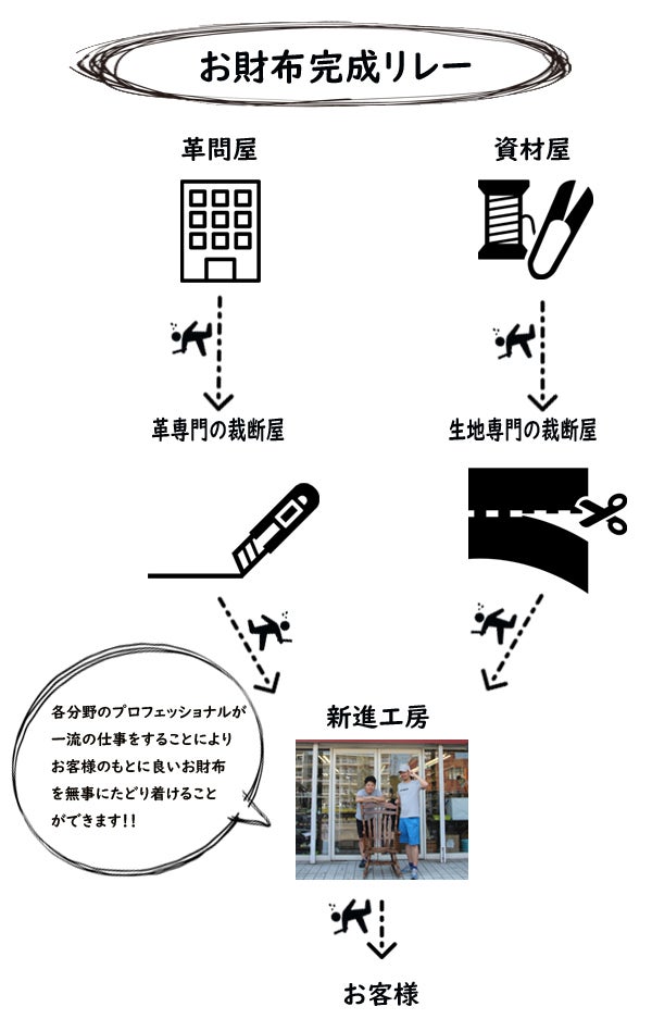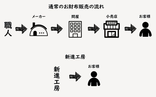 お財布はお客様の手に届くまでに多くの中間マージンや物流コストが発生しています。それに比べて新進工房の仕組みはシンプルです。