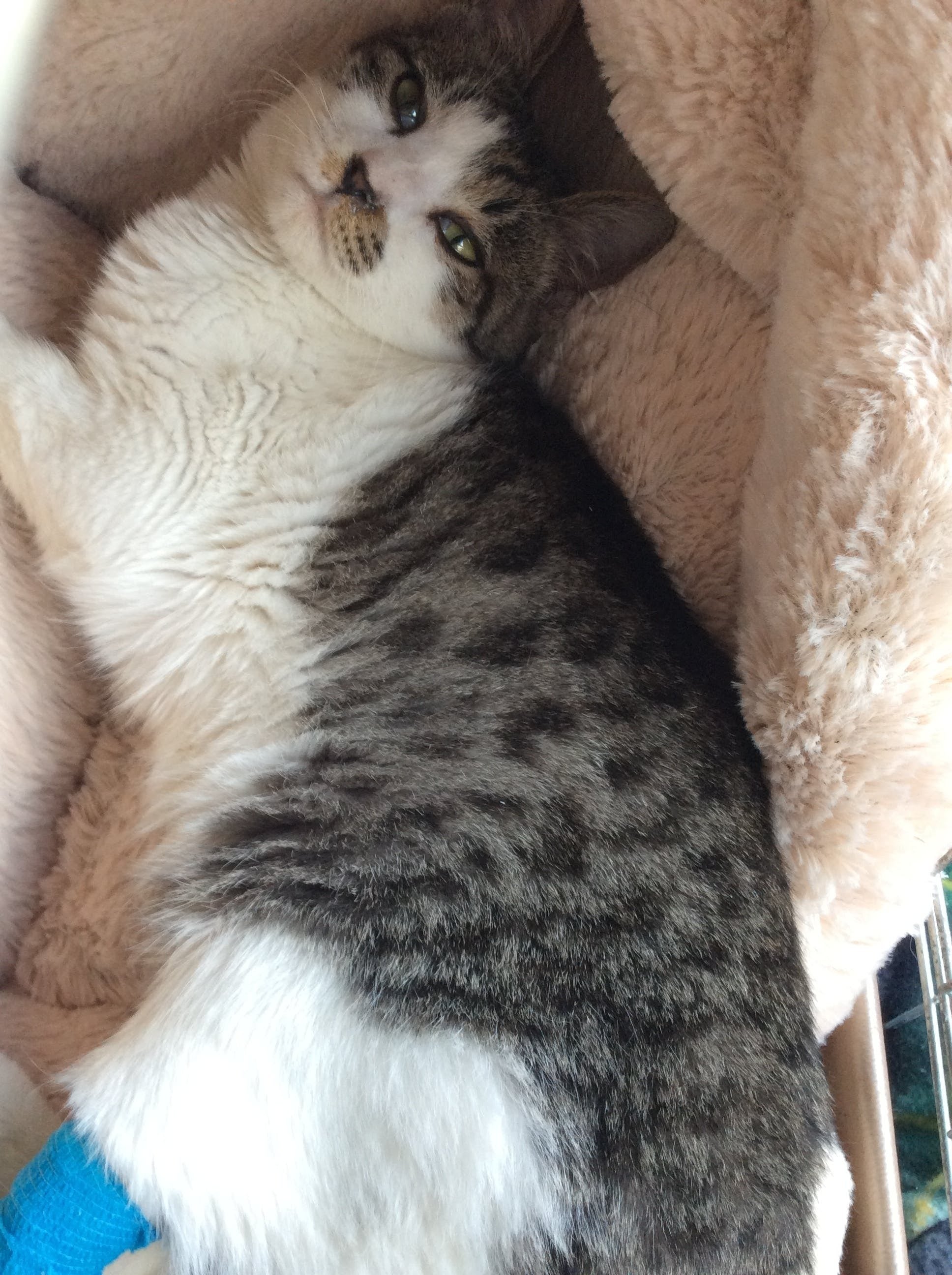 左手の骨折があり、親猫に捨てられたか、人によって捨てられたかは分かりませんが、