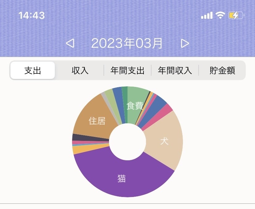 円グラフで見るとワン、ニャンの出費が半分以上占めている!いやー改めてビックリでした。