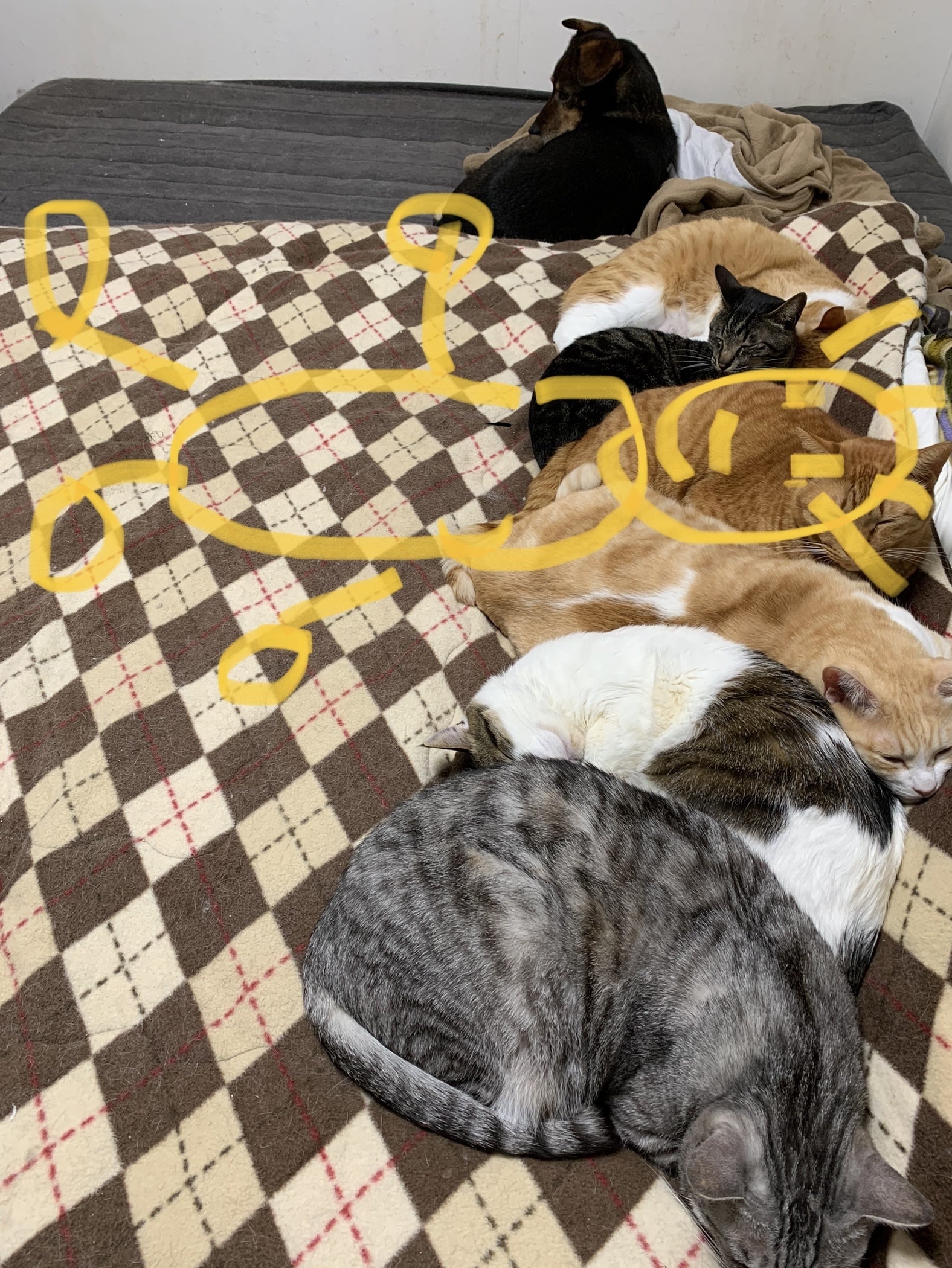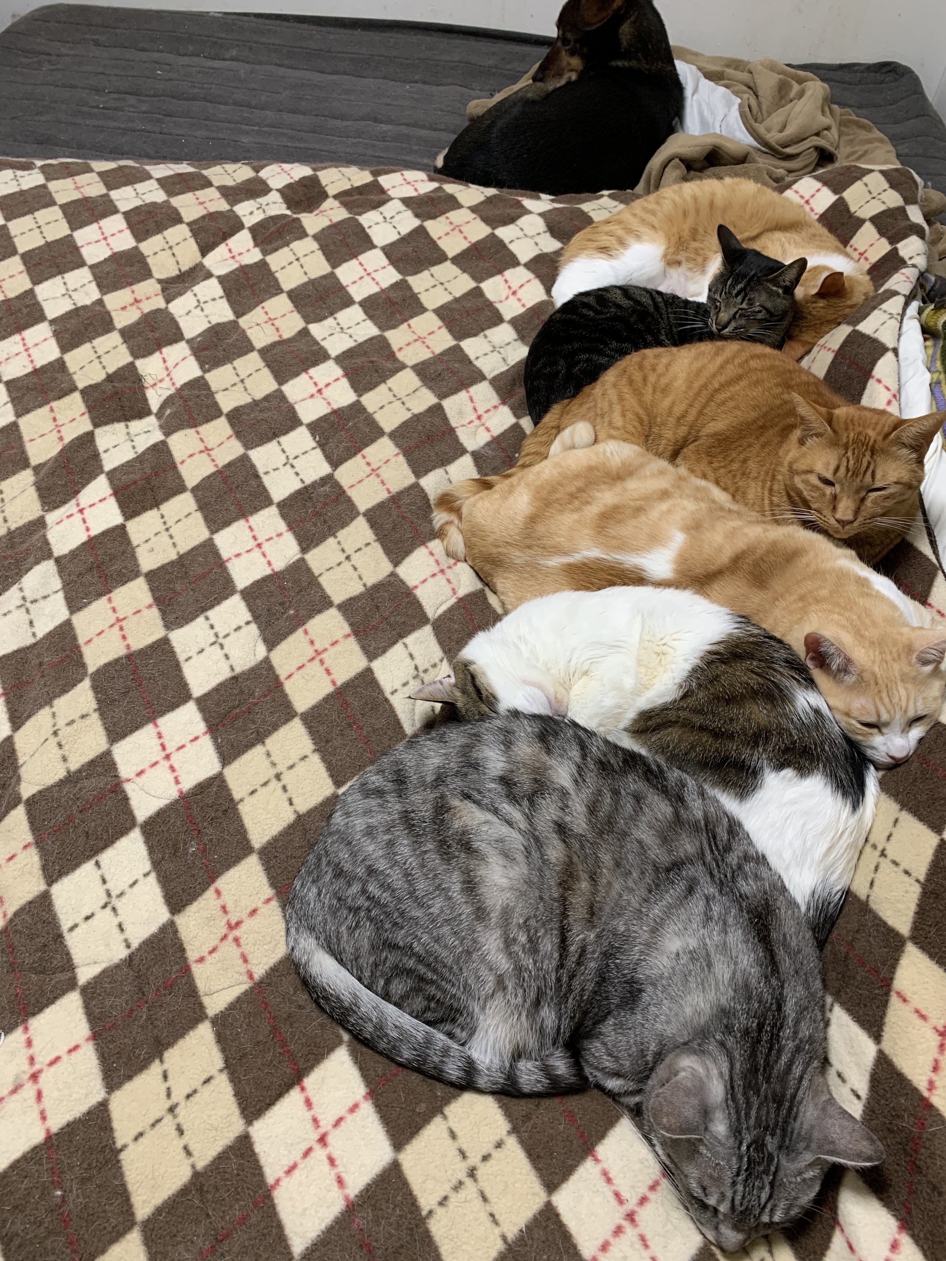 夜、ニャン達が一緒に寝るので足が伸ばせないとか、寝返りができないとかはありましたが、昨晩は…