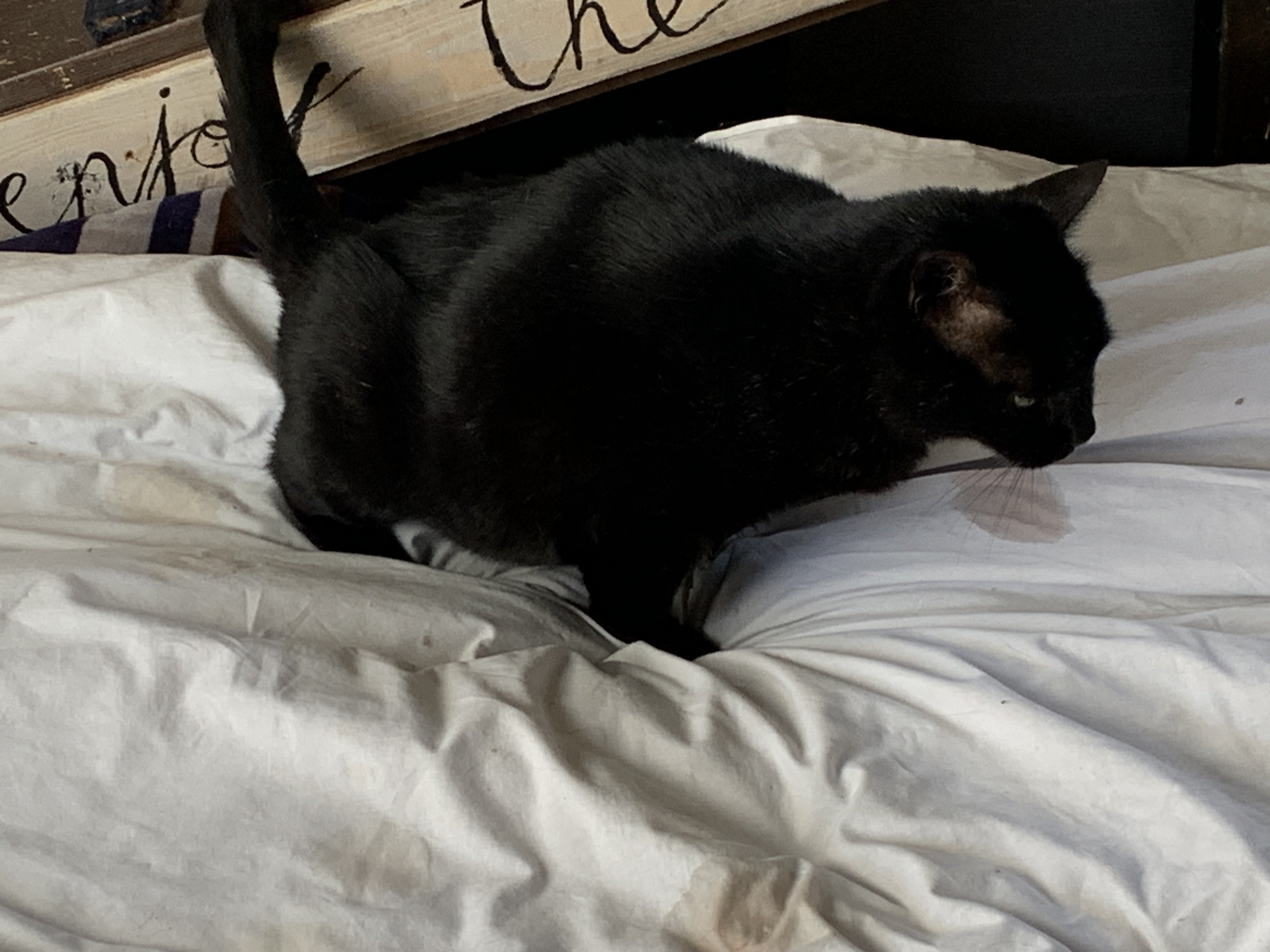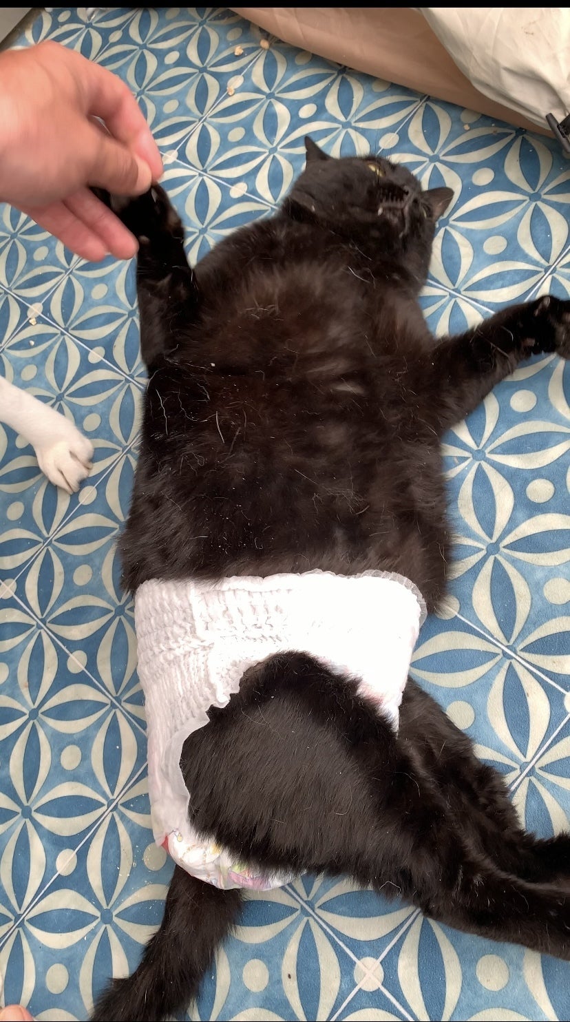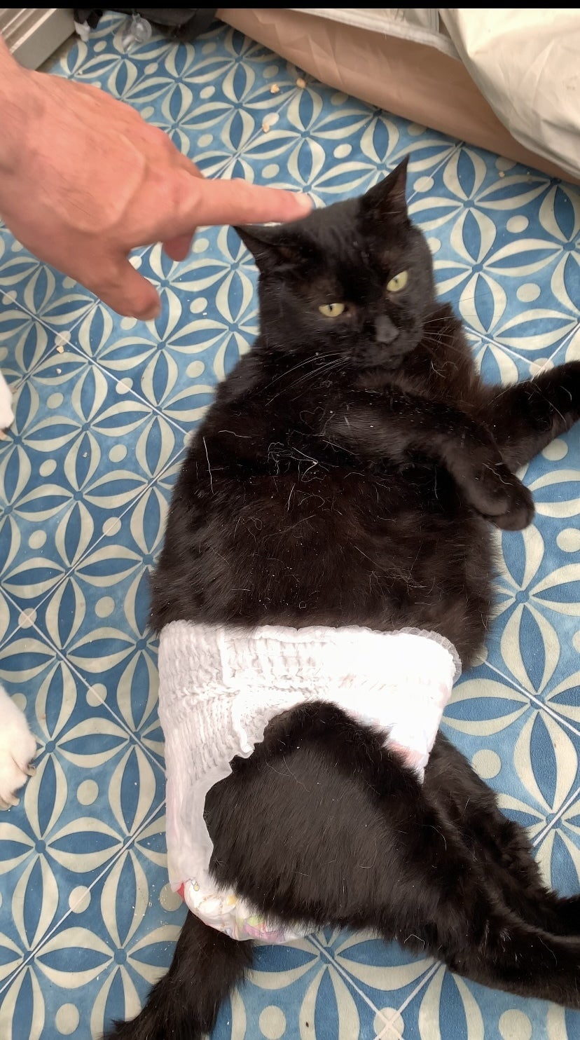 猫用オムツは入らなかったので 人間の赤ちゃん用Mサイズ。嫌がりもしない。
