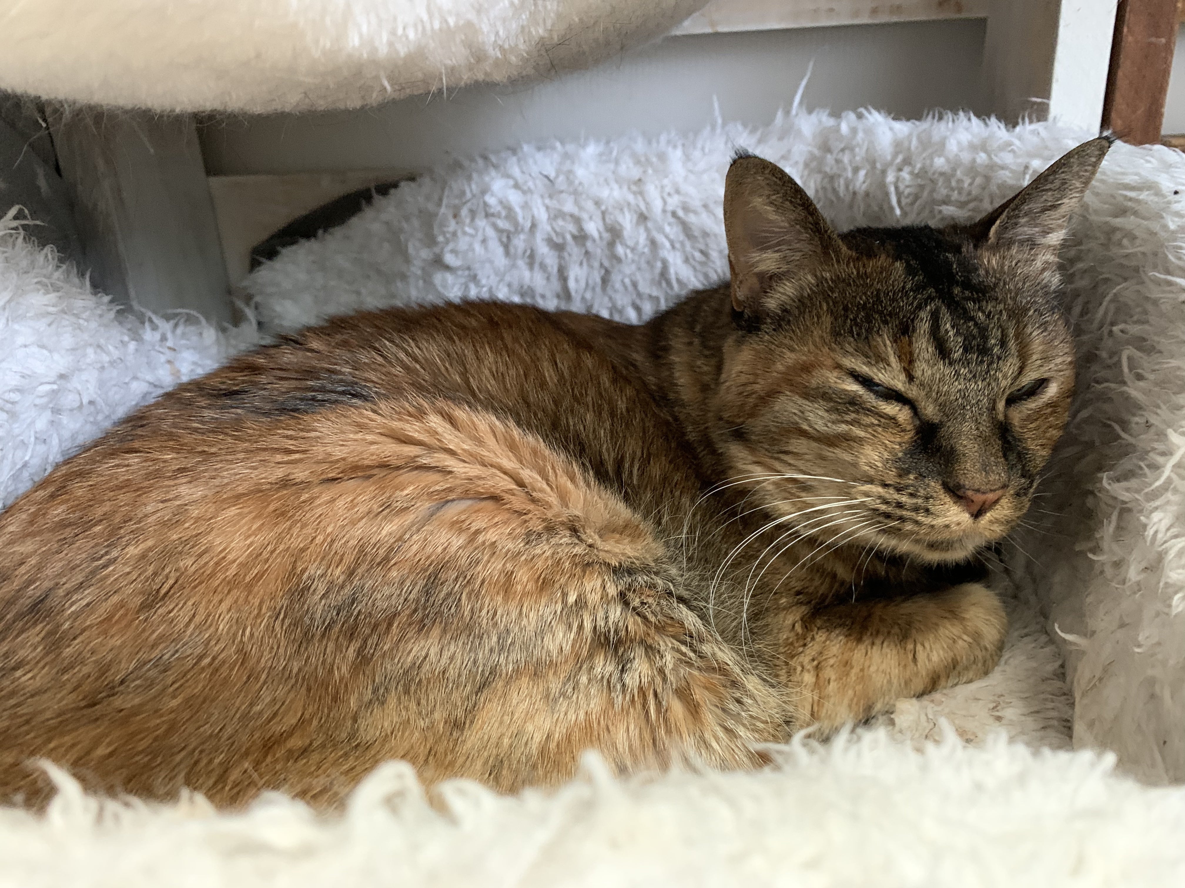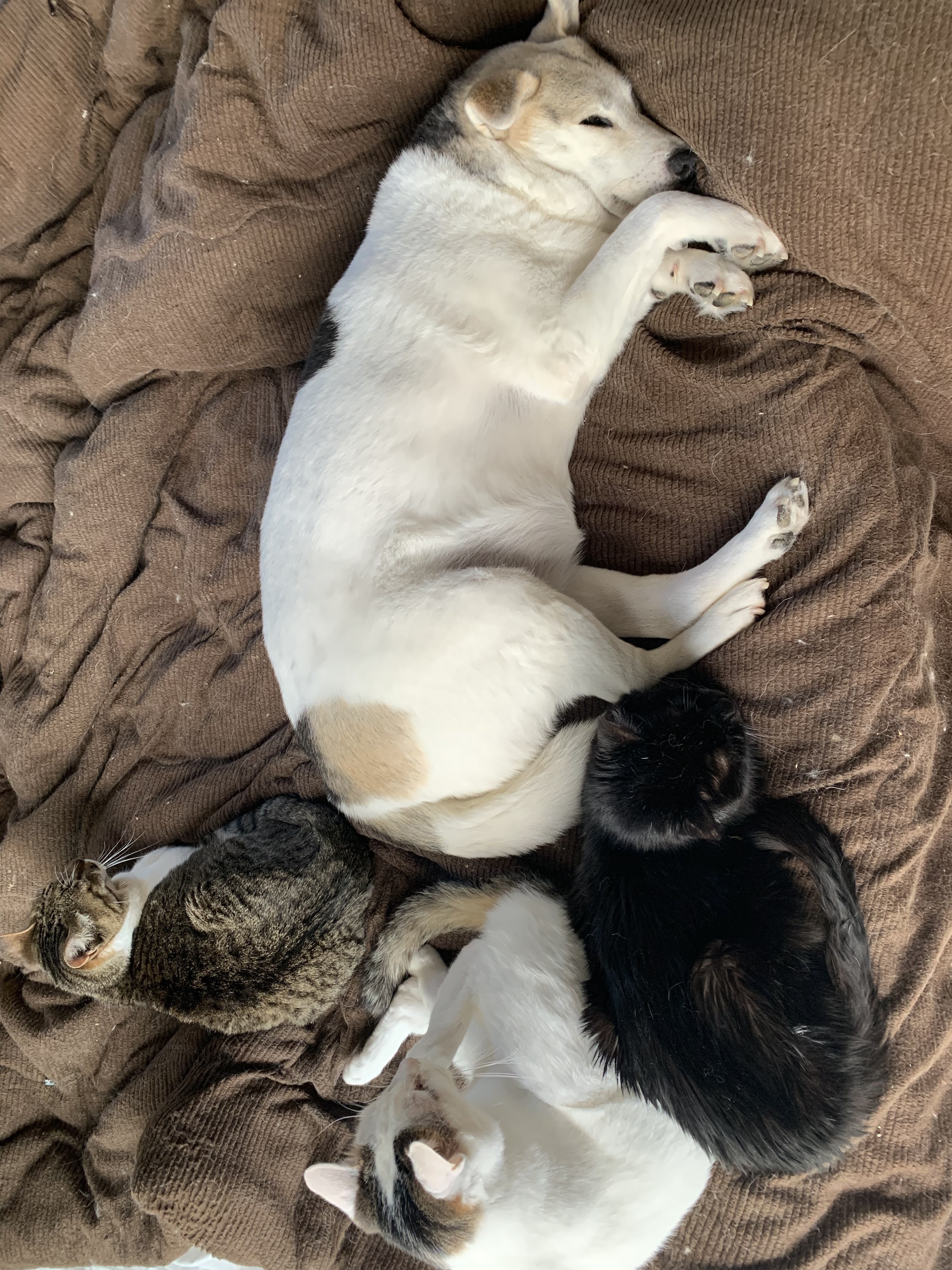 小町ちゃんに寄り添って寝ている、とらみ、次郎、五郎。