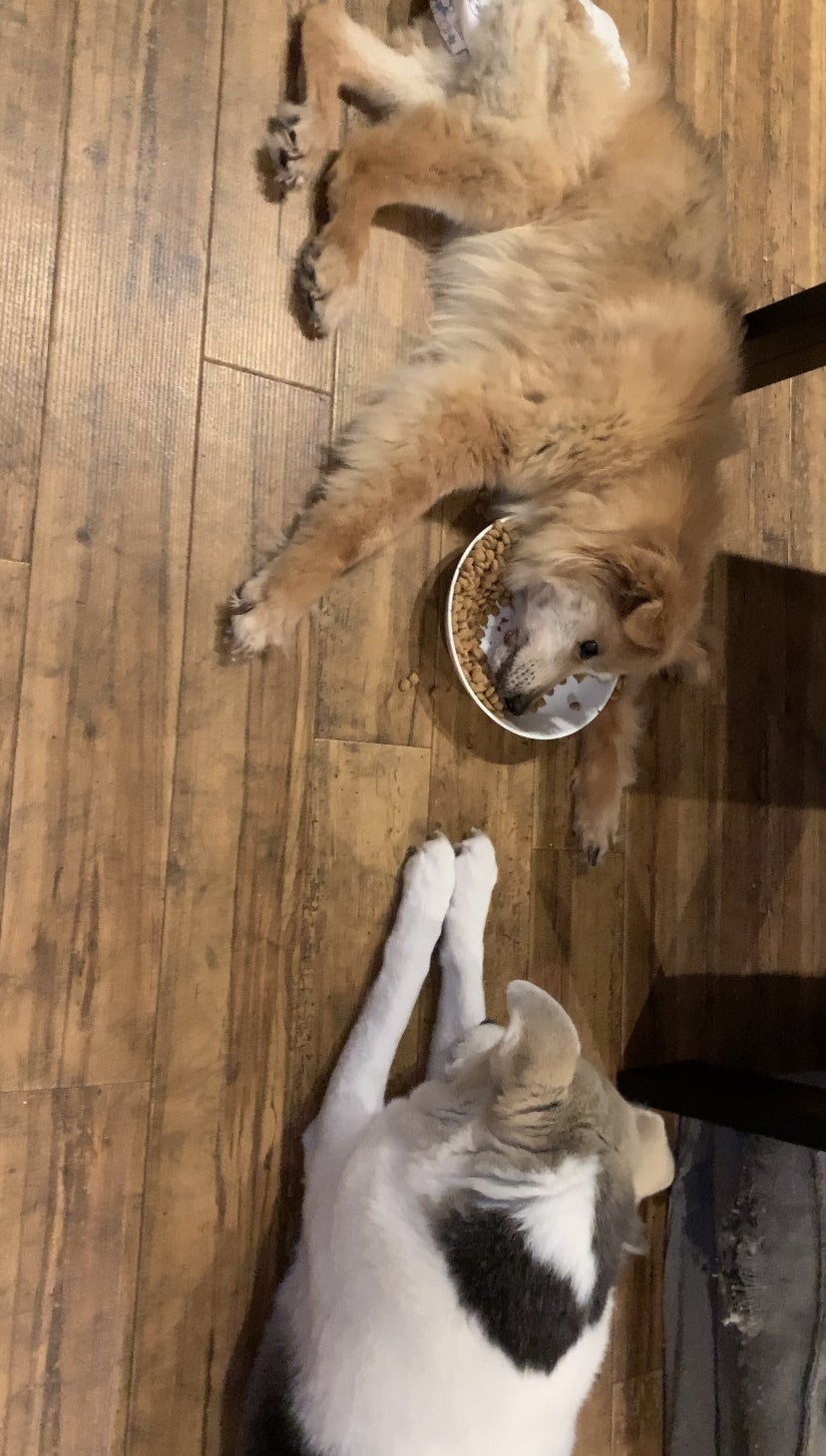 寝たままだけど必死にご飯を食べる小梅ちゃん。
