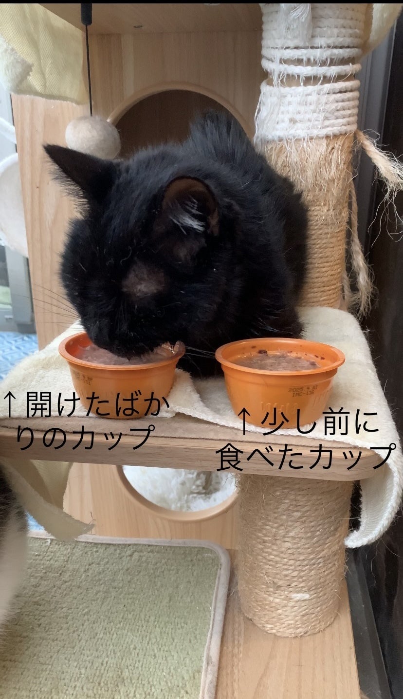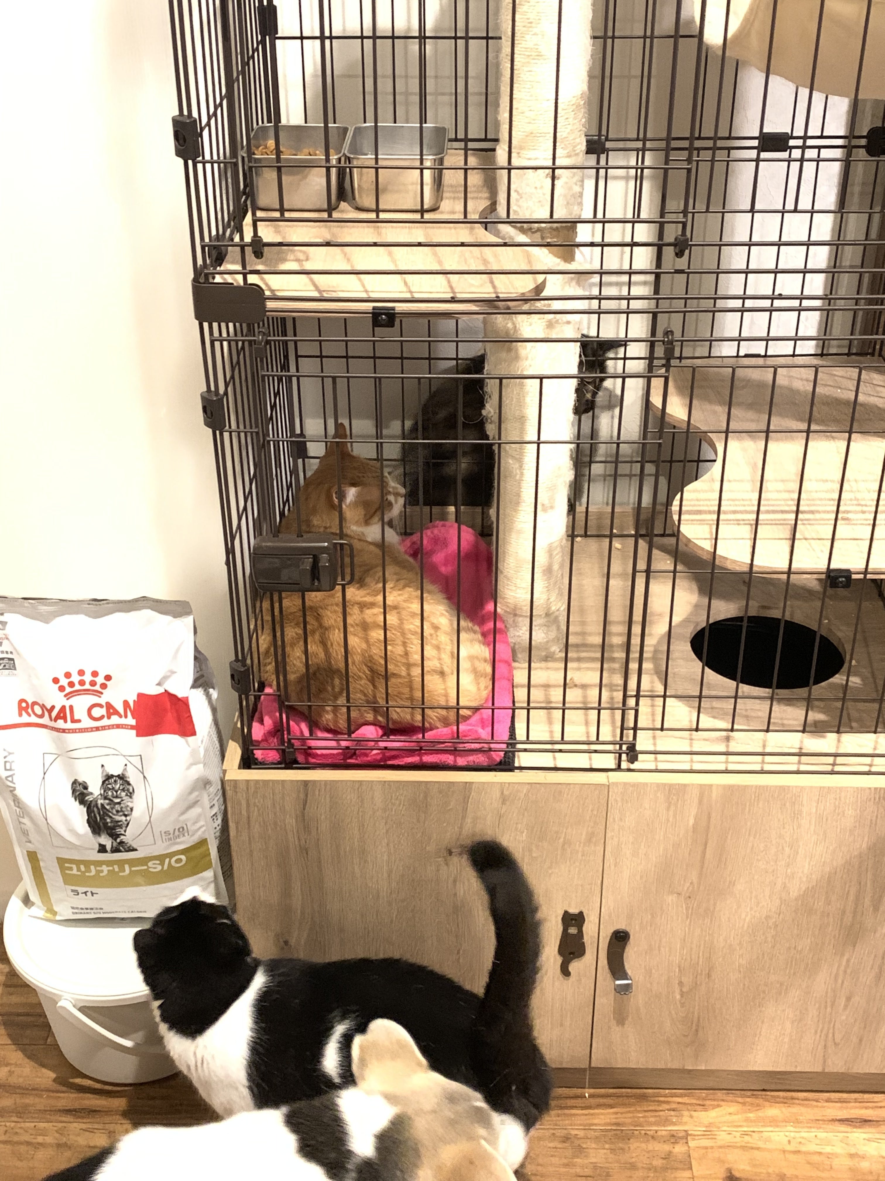今は尿ケアフードを食べてもらう為にケージに入れました。
