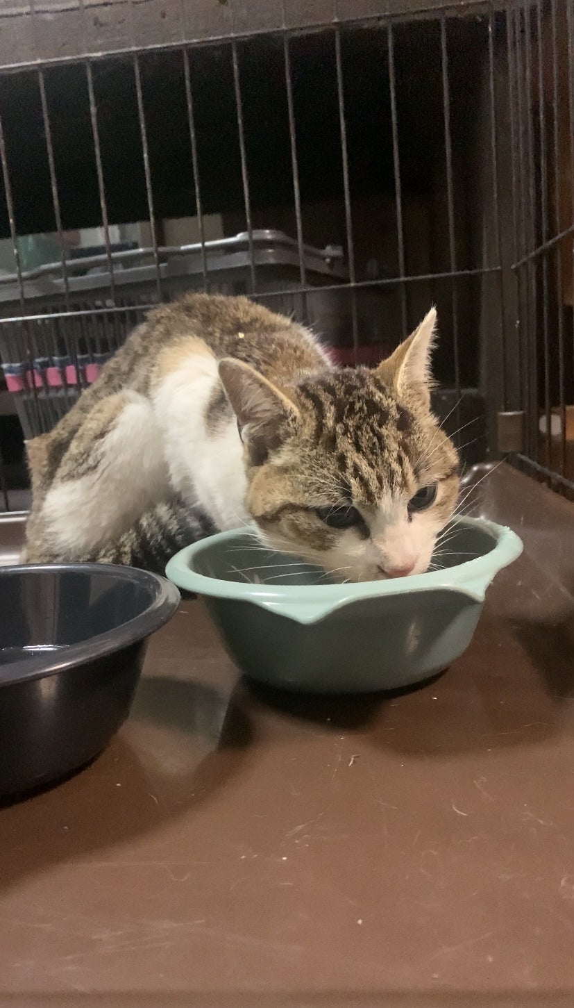 車の通りが多い国道なので驚かせて道に出ると危ないので、保護するまでは大変だったけど、家に連れて帰ったらびっくりするくらい落ち着いてご飯食べてる!