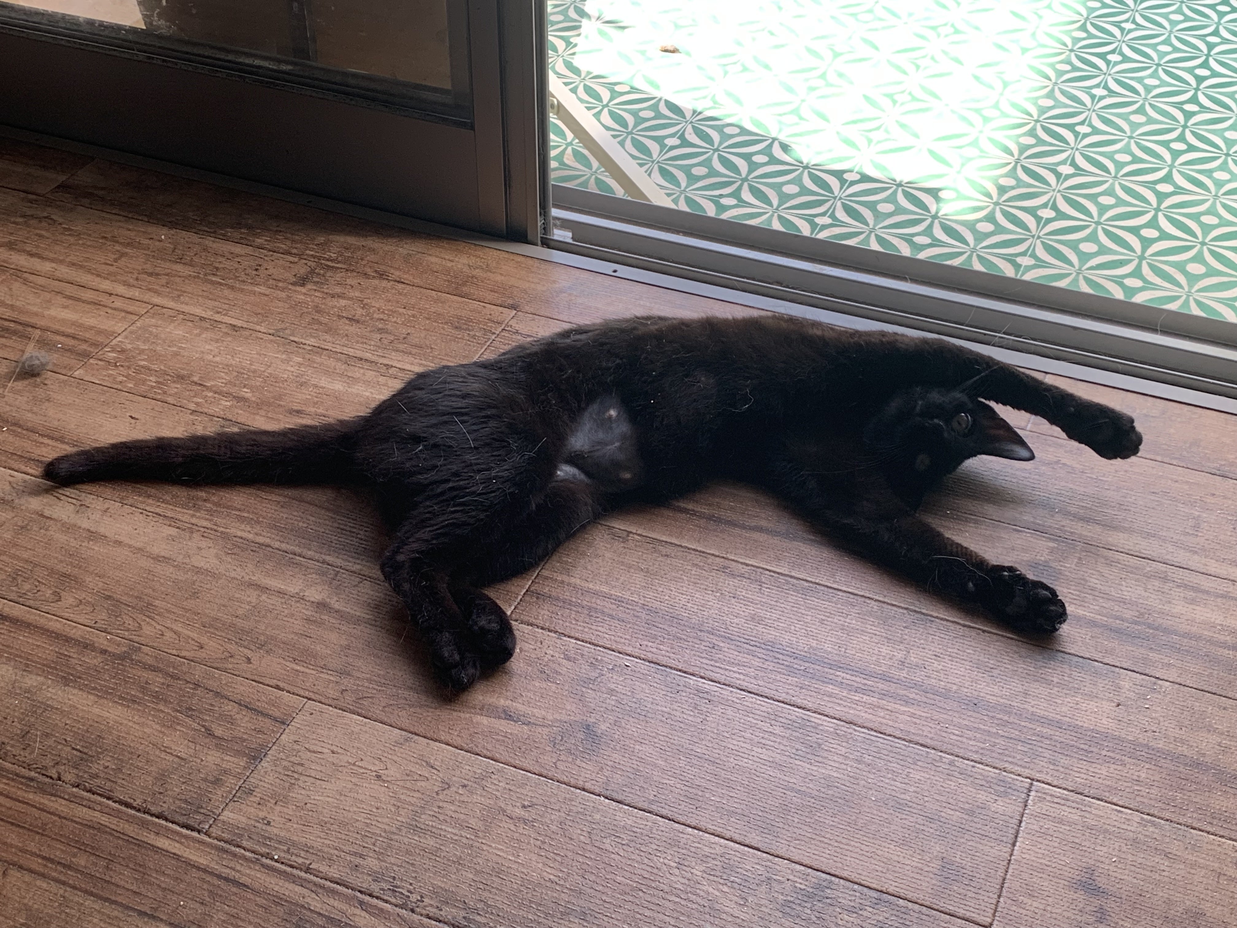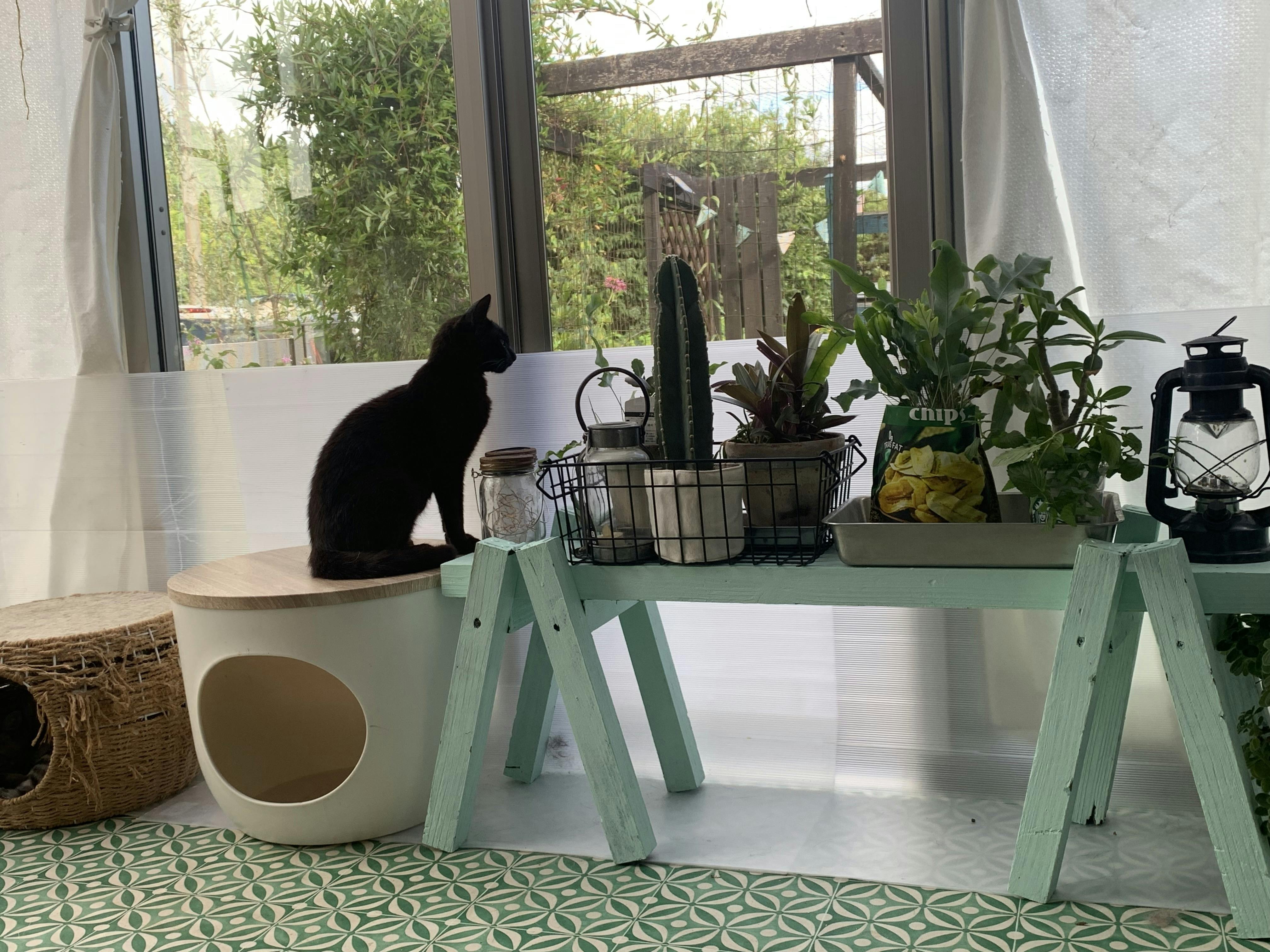 キャットケージからなかなか出てきてくれなかった正子ちゃん、最近ではリビング、テラスで寛いでいます。