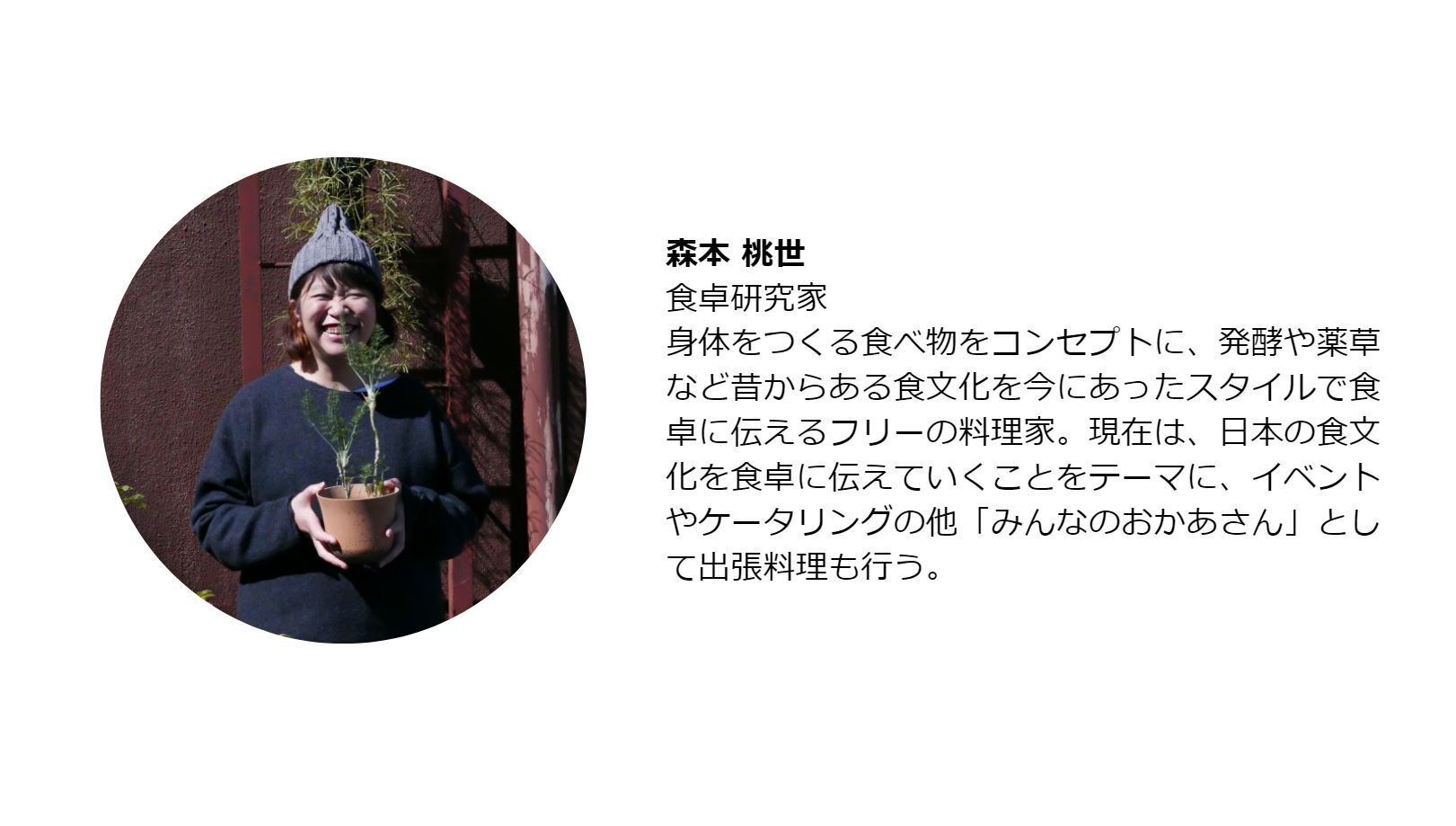 ももさんは、ご自身の体験から体は食べ物で作られていることを実感し、以降「食べものがからだをつくる」をコンセプトとしたフリーの料理研究家として活動されています。活動内容は幅広く、イベントのケータリングやオーガニックレストランをはじめとした店舗でのシェフ・運営、レシピの開発・掲載、「みんなのお母さん」として産前産後のご家庭を訪問し料理の提供を行う出張料理などもされていました。(「森本桃世 レシピ」で検索してみてください、素敵なレシピがたくさん出てきます!)
