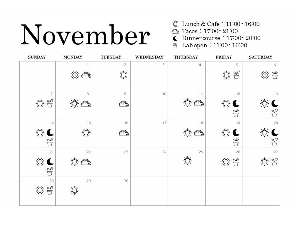 営業日については、様子を見ながら決めていきたく、しばらくは不定休とさせていただくことにしました。毎月営業カレンダーをinstagramにて更新し、随時情報もSNSにて発信していきますのでご覧くださいませ。11月はこのような形です!