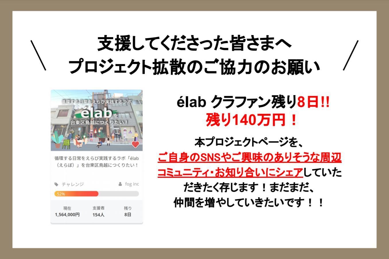 皆さんこんにちは!fogの大垣です。昨日から改めて多くの方がシェアしてくださったおかげで、プロジェクトページのPV数が過去最高、支援額も大幅に伸びました!新たに支援してくださった方、1度目、2度目、何度も!シェアをしてくださった方、ここまで見守ってくださっている皆さん、本当にありがとうございます。残り7日となった現在、<1,778,000円(59%)>到達です!(日中時点)あと1週間、引き続きどうぞよろしくお願いいたします!さて、本日は野趣メンバー會澤(以降さえさん)により着々と進んでいるマテリアルラボの進捗をご報告です。先週金曜日から、さえさん・植物販売で連携させていただく草人-kusabito-さんがマテリアルラボにて作業に入ってくださり、植物を置くための棚の設置が行われました。ここには元々余白さんが作り使われていた木枠があり、垂木を差し込み板を渡せば物が置けるようになっています。優しい余白さん、どうぞ使ってくださいとおっしゃってくださり、有難く使わせていただくことに。ありがとうございます。植物はある程度重さがあり、幅の広い板の上にそのまま載せるとたわんで危険なため、板の下にも垂木を設置しました。下記はさえさんによる説明です!(野趣グループ内のスラックより)ーーー◆デザイン多段にすることも検討したのですが、そうすると日光がうまく入らないため、テーブル状の台を窓辺につくり、各鉢へ光がいちつつ前面から見えるように、端材などで高さの微調整をしました。タテ材には今後フックを設置して吊る系をかけていきます。結果、なんとなく宙に浮く箱のような構成になりました!これから、リンゴ箱など、いろんな器としての箱がこの空間を埋めていくと思うと、その第一歩かなぁというきがしています。◆仕上げ無塗装です。今後必要あれば仕上げましょう。現状でも悪くないかと。あと、杉材は鉄媒染したら墨入れなくても真っ黒になりました。。感動しつつ、ちょっと黒すぎてどこに使うか検討中。◆構造ビス留めは構造となる柱梁に直接穴を開けないように、中間材に留めていますので、追々棚の場所やつくりかたの変更には対応しています。ーーーそして植物を置いていくとこのような感じに!にぎやかで綺麗です~。今日も作業してくださったので、それはまた別の時に。金曜、土曜、日曜はマテリアルラボエリアを一般の方向けに開放し、植物や古書、その他素材などの展示販売を行います。オープンしたら、ぜひ植物にも会いに遊びに来てくださいね。以上、現場の進捗でした!
