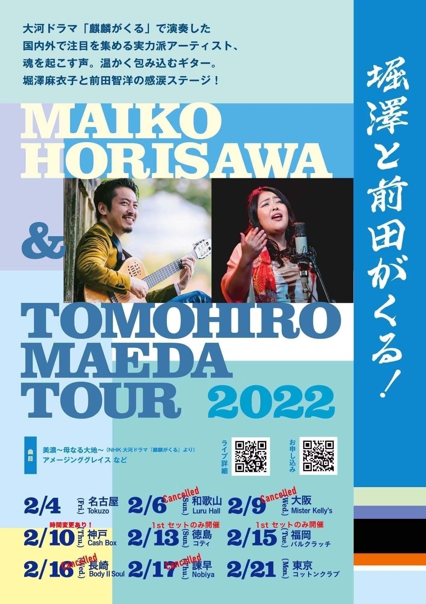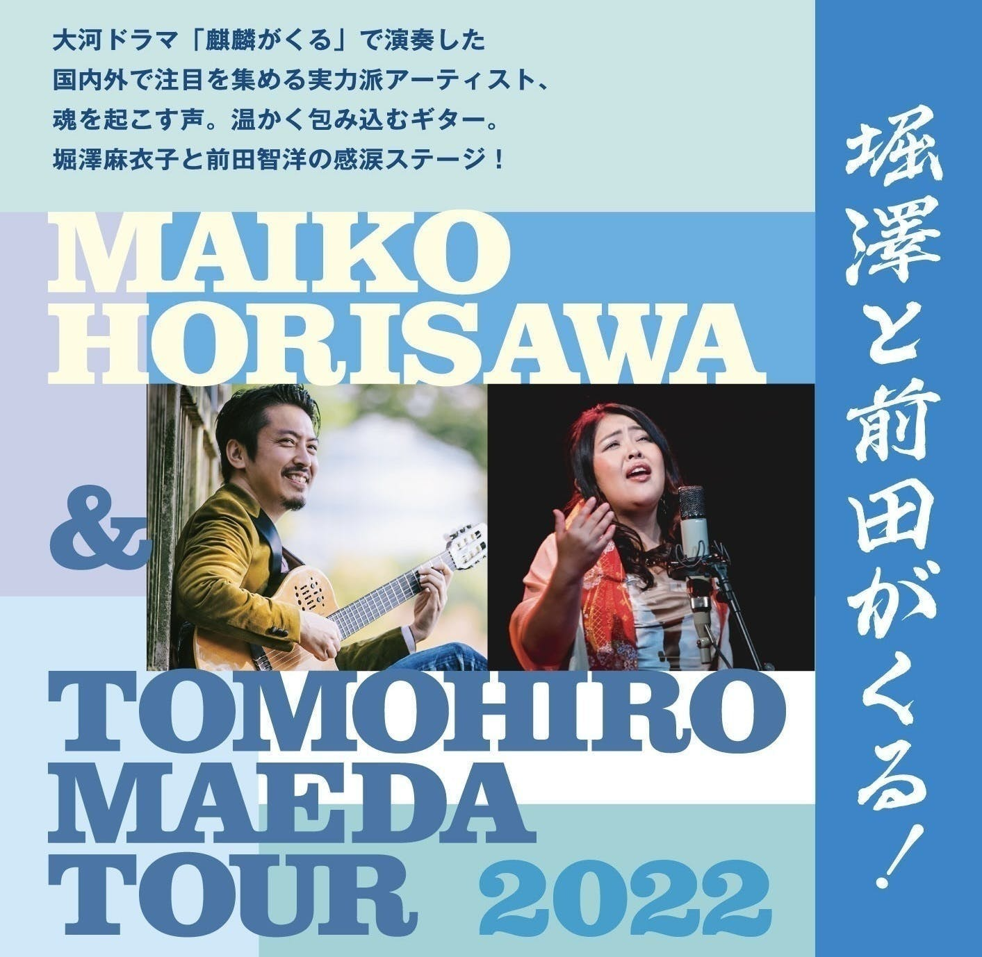 2022/02/10 12:07●2年ぶり ライブ報告2/4名古屋公演「堀澤と前田がくる!」2/5に岐阜(プライベートコンサート)での公演を終え、今日は、2/10神戸です!ライブとボイトレで頂いた感想や、活動報告致します!たくさんの皆様、ご支援、本当にありがとうございます。そして、リターンにもご用意している2/12~13に行われる、「淡路島リトリート」についても記載しています!ぜひ、ご支援とともに、心と身体と頭を洗い流しに、いらして下さいませ♪名古屋・岐阜公演は、本当にエネルギーの充満した2日間でした。大河ドラマ「麒麟がくる」では、10曲ほど歌っているのですが、その中でも、代表的な曲を多数お届けし、その他、今回のコロナ禍の中で、作詞&作曲した新曲を数曲、皆様にお届け致しました。歌っている最中、この2年間、一緒にツアーをできなかった、ギタリストともくんと顔を合わせながら演奏し、舞台上で涙が止まらなくなってしまいました。ああ、こんなに歌いたかったんだと気づかせてもらえました。●喜びの感想ライブが終わったら、初めてのお客様が久しぶりに生で音楽を聴いたけれど、やはり生の音楽は全く迫力が違う、またぜひ来たいですとおっしゃって下さいました。そして、やっぱり「麒麟がくる」の曲は最高だった、作詞作曲の「いいんじゃない?」に勇気をもらったなど、かなりたくさんの方に喜んで頂け、皆様の魂の応援に歌をお届けにいくことができ感無量です。また、岐阜では明智 光秀のゆかりの地で、恩師の快気祝いに歌をお届けできて、幸せでした。恩師には長きにわたり「愛のある生き方」について教わって頂き、恩師あってこそ、今だと感謝ばかりです。全国 ライブ&ボイトレ: 2/10 神戸、2/12~13 淡路島リトリートツアー、2/14 福岡、 3/6 東京 名古屋のライブの前は、ソーシャルディスタンスを保ちながら、短い2時間のボイトレをさせて頂きましたが、声を出しながら日々の溜まっていた感情をデトックスして、メンタルアドバイスをお伝えしたら、心のつっかえが取れ、泣く方もいらっしゃいました。泣いたあとのあの晴れ晴れとしたお顔を見ることでお役に立てたことを嬉しく思い、ランチをしながら、これからの時代について皆で話し合い、楽しくどう自分を変化させていくか、一人一人と話すことで、お持ちの鋭い感性を感じながら、有意義な時間を過ごしました。みなさんとのいい氣が循環をしてからの、コンサートはいつも以上にパワーとエネルギーが満ち溢れ、声、心、身体、が「三位一体」となって繋がり、みなさんとも、言葉をかわしていなくても、魂が繋がった感覚がありました。繋がってくださり、本当にありがとうございます!そして遠くで見守って、応援してくださる方もいつも本当にありがとうございます●ボイトレ 喜びの声●本では読んでいましたが、やはり、実際に教えてもらうととてもわかりやすくて、声の変化や体幹なども感じられ、とても勉強になりました教えてもらった呼吸法で、メンタルを安定させ、日常から不安なことを考えすぎず、楽しく歌い、過ごそうと思います麻衣子先生のレッスンを受けて、声はもちろんだけど、心が救われて、悩んでいることがストンと落ちて表情がパッと明るくなり前向きになられた方の姿を目の前で見て、なんか私も自分の事のように嬉しくなり、気がついたら、自分の心もスーっとして元気になりました。こうやってたくさんの方が歌を歌いながら、マイナス思考の癖を外し、救われてる方がみえるんですね〜〜〜〜〜〜〜〜〜〜〜〜〜〜〜〜〜〜人は、声の音量=人間のエネルギーと感じているため、声が出るようになると、魂が起きるように、その人の人間エネルギーが声となって現れ心と身体と声が統合します。お話しながら、「その方にだけ響くメンタルアップワード」を伝え、声に出すと、心につっかえていたことがわかり、心の鎖がほどけて、自分本来のエネルギーを取り戻し、声も表情も変わっていかれます。声を出す、歌うことで楽に高い声もでるようになり、心のトレーニングにもなります。ライブツアー、特別ボイトレ2/10 神戸+ボイトレ2/11~13 淡路島リトリートツアー2/13 徳島2/14 福岡ボイトレのみ2/15 福岡(ソールドアウト)2/21 東京(残りわずか)========================2/12(祝~2/13(日)1泊2日淡路島リトリートツアー https://maikohorisawa.com/awajishima-retreat-tour/(私が主催するのは、2/12~2/13です) ========================イメージを動画でお届けします今回の淡路島リトリートツアーは、目の前が海のホテルで心と身体と自分を解放します!海の前で声を出し、自然の中に自分を置くことによって声と共に本来の自分を取り戻し、これからの楽しい人生について未来年表を一緒に作り上げていきます淡路産の地の物で、美味しい食事を頂き、美しい自然に触れ、自らも声を出し、これからの自分らしい人生のために、頭の中を整理整頓するリトリートツアー日本のハワイと言われる淡路島。淡路島は土地の気が素晴らしく、陽