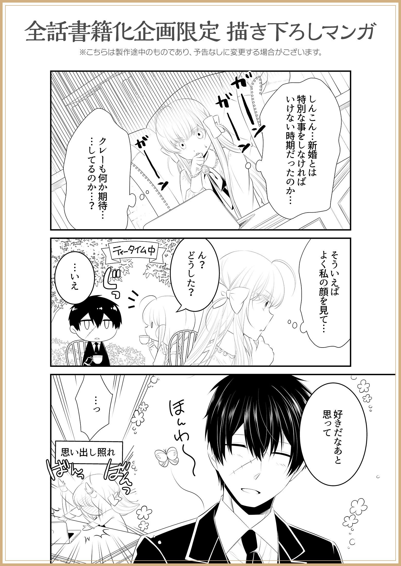 鋭意制作中のほやほやの状態で一部公開しています♪本企画のためにシズ先生に描き下ろしていただいたここでしか読むことのできないローゼとクレーの新婚の姿を是非、ご堪能くださいませ!