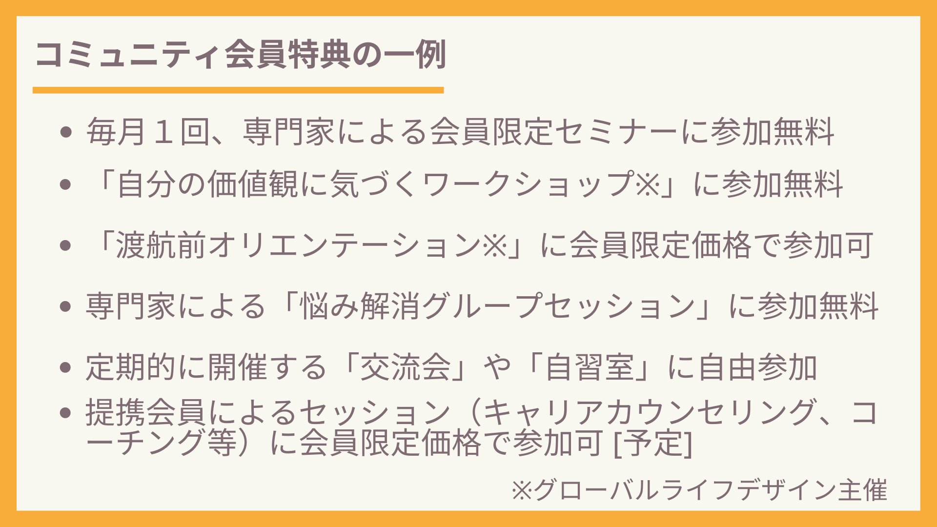 このオンラインコミュニティに参加することで、お互いに助け合いながらたくさんの刺激を受け取り、学び、楽しみ、海外経験が一生の財産になるようにしっかりサポートしていきたいと思います。