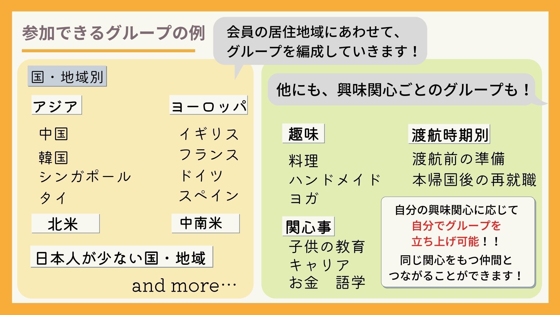また、「旅行」「料理」「ハンドメイド」「キャリア」「子どもの教育」など、興味関心別のグループも作り、国を超えて会員同士の交流を図ります。仮に日本人が少ない環境であっても、同じ関心ごとでつながれる仲間とともにオンライン上で「部活に参加する」ような感覚で実りある時間を過ごすことができます。