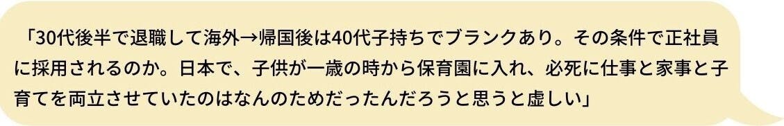 グローバルライフデザインが2017年7月に駐在妻と元駐在妻を対象に実施したアンケート(回答者180名)では、20-30代の回答者のうち9割以上が、「仕事、キャリアについての悩みがある(あった)」と回答しており、自由回答欄にびっしりとつづられた声の一部がこちらです。